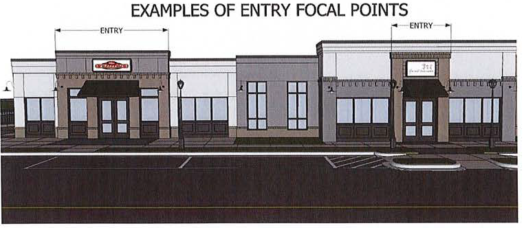 Primary entrance, and individual tenant space entries, shall be designed to express greater architectural detail through the use of awnings, recessed/projected entries, changes in material, variations of the material patterning, or other similar techniques intended to create a focal point at the entry (diagram F).