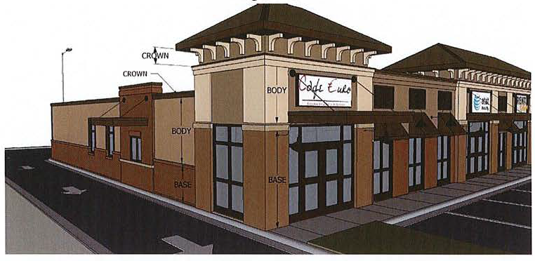 Colors. Earth tones (greens, tans, light browns, terracotta, etc.), grays, pale primary and secondary colors (less than 50 percent color value), white cream tones, and the like. Dramatic accents and/ or primary colors, may only be used for small areas such as trim, logos, or to distinguish an architectural feature. In no instance, shall the combination of dramatic accent color or primary colors compose more than ten percent of any building facade. It is highly recommended that material selections and/or colors are layered horizontally and detailed to present the appearance of a base, body and crown. Simple metal coping topping a parapet is not considered a design element and will not be considered a crown (diagram G).