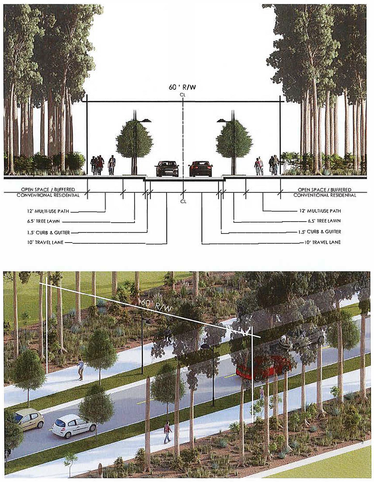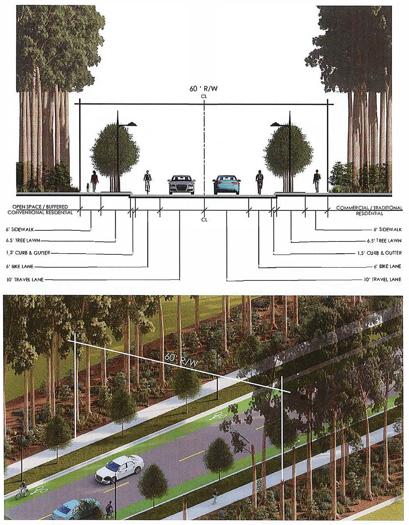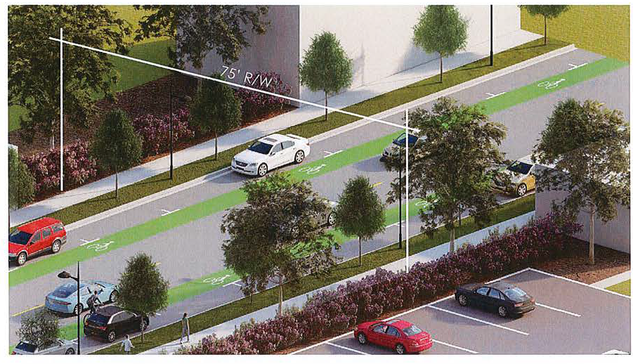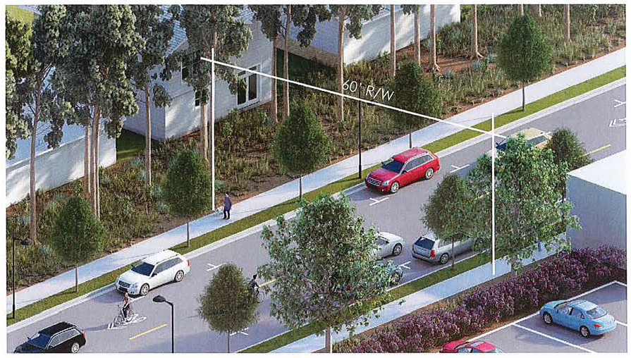 Connector Streets typically running parallel to Hwy 21 and connecting Arterial Streets shall have a right-of-way width of 60' or 75'. The street design and layout shall follow either Option 3 or Option 4 below. The Review Board will work with the developer to determine the appropriate street design. Street Design goals are: