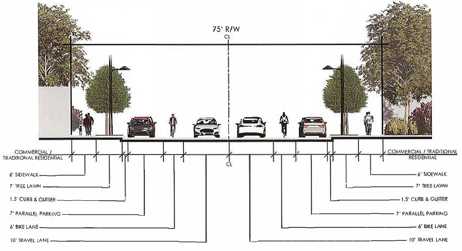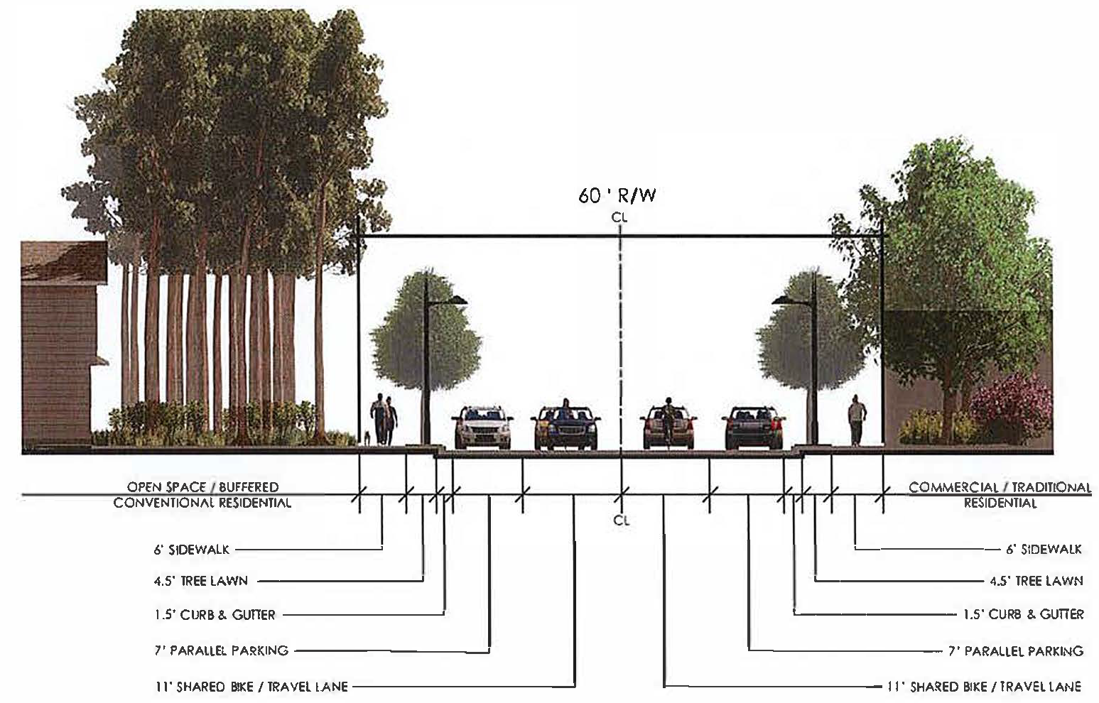 For all new streets, street trees spaced 30' to 60' on center shall be provided. Species shall be a large or understory species. Spacing shall be 30' to 45' o.c. for understory and 50' to 60' o.c. where large species are used.