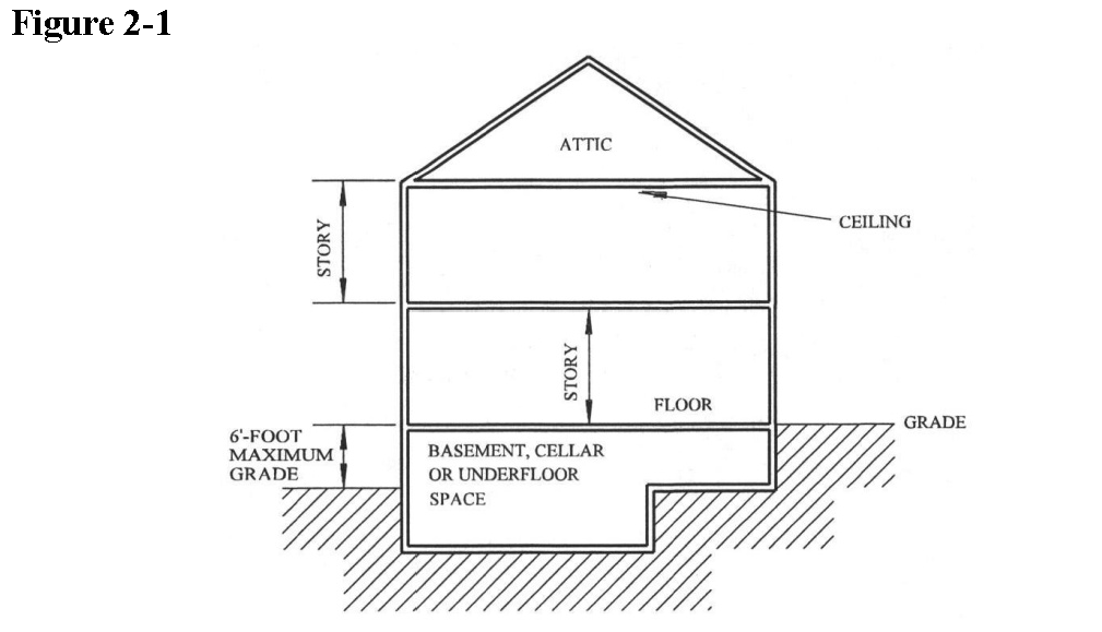 Story: That portion of a building included between the surface of any floor and the surface of the next floor above it, or if there is no floor above it, then the space between such floor and ceiling next above it (Figure 2-1).