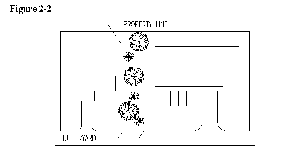 Bufferyard: Land area typically containing trees, shrubs and other plants, berms, fences or walls and used to visibly separate one use from another or to block noise, lights or other nuisances (Figure 2-2).