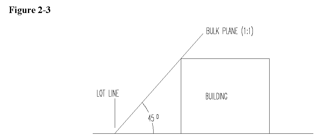 Bulk plane: A theoretical plane beginning at a lot line, or other locations as set forth in this Article, and rising over a slope determined by an acute angle measured up from the horizontal as set forth in this Article. The bulk plane defines the relationship of the height of a structure and the structure's setback from the lot line (Figure 2-3).