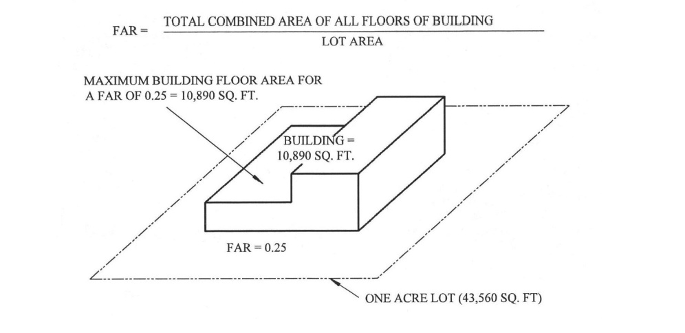 Building floor area, total: The total floor area of all floors of a building measured from the exterior face of exterior walls, but not including interior parking spaces, loading space for motor vehicles or any space where the floor to ceiling height is less than six feet.