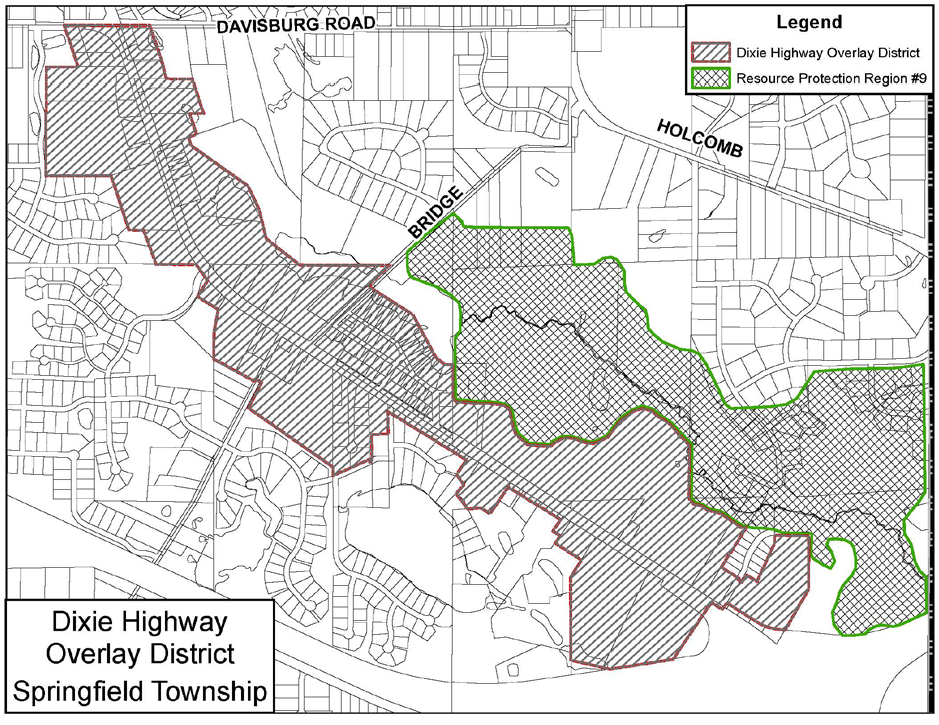 The Dixie Highway Overlay District includes parcels fronting Dixie Highway from I-75 to Davisburg Road as illustrated on the Dixie Highway Overlay District map which is included at the end of this section and is attached to and made part of the official zoning map of the township. Also shown on the map bordering the Dixie Highway Overlay District is Region 9 of the Resource Protection Overlay District, provisions for which are detailed in section 40-892 of this chapter.