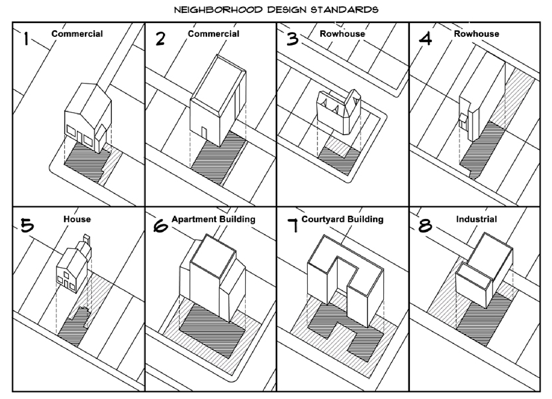 Various aspects of these design goals are demonstrated by the following building typologies, the use of which is strongly encouraged when designing new construction or expansion of existing buildings: