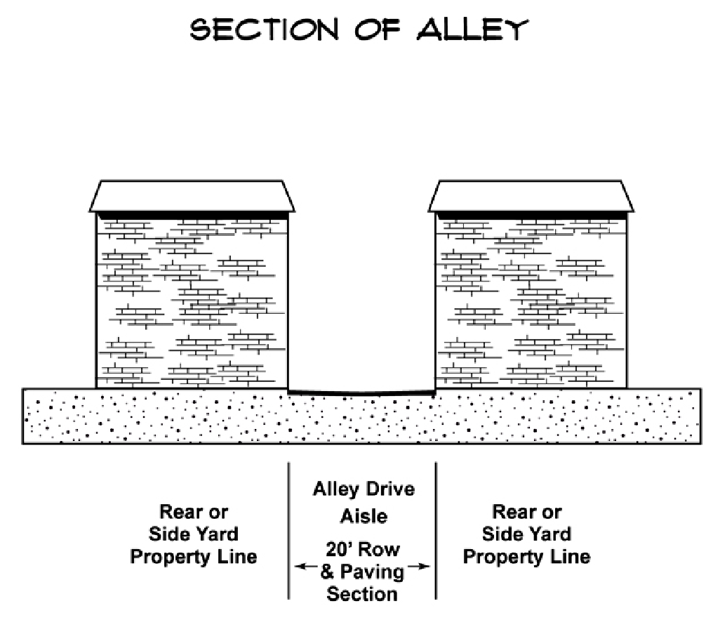 Alley: Private right-of-way dedicated for the use of pedestrians, vehicles or public utilities as a means of access to abutting property.