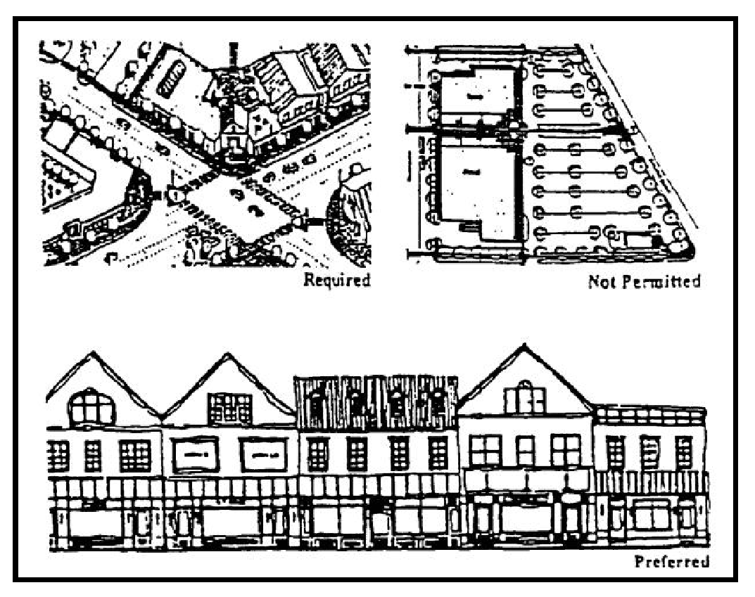 Development is strongly encouraged to conform to the principals of traditional neighborhood design (high density, mixed use, and pedestrian friendly). Modern architectural design will be considered when appropriate.