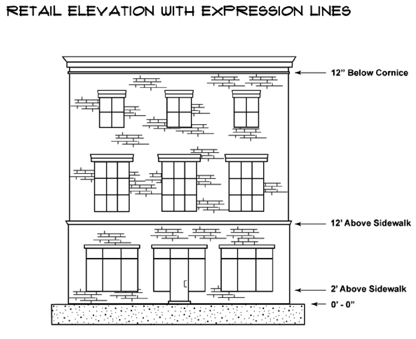 Expression line: Horizontal line or lines, running the length of the façade represented by a materials change or continuous setback no more than twelve (12) inches in depth or six (6) inches in projection.