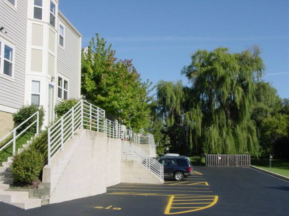 Provide pedestrian walkways and islands for the main circulation route(s) to the building entrance within parking lots having more than 40 parking spaces. These walkways should be clearly delineated with pavers, bituminous brick pattern stamping or painted striping.