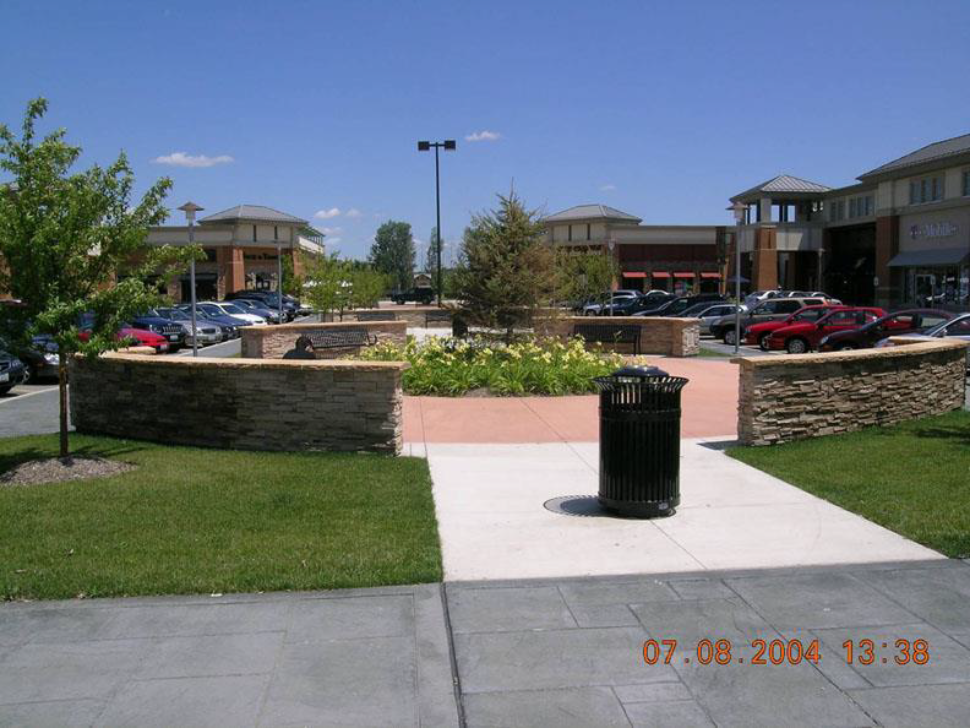 Public plazas help to minimize the effect of large parking areas and distinguish the path to building entrances.