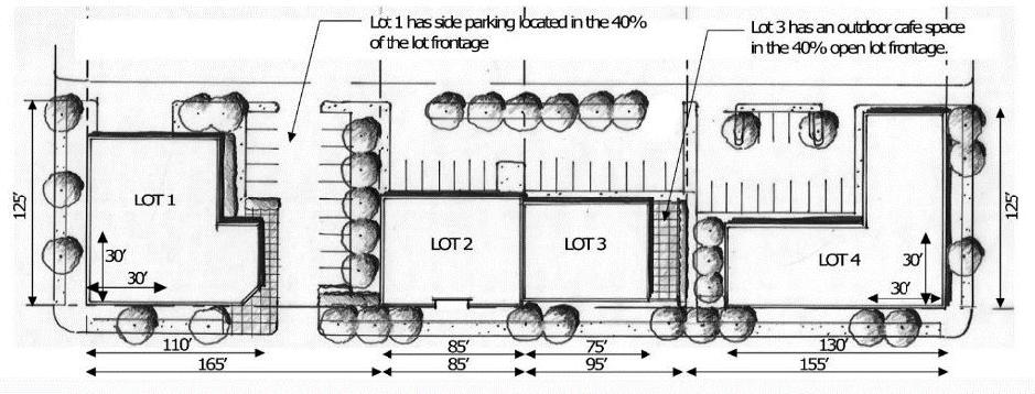 The building shall have entrances to a street or public open space spaced no more than one hundred (100) feet apart.