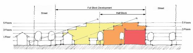 The height of a new building should fall within a range set by the highest and lowest contiguous buildings if the block has uniform heights. Uncharacteristically high or low buildings should not be considered when designing new construction. Therefore, the height of a new principal structure in the SSCNO District shall be no more than ten (10) feet higher or lower than the average height of all existing contiguous principal structures, not to exceed thirty-five (35) feet.