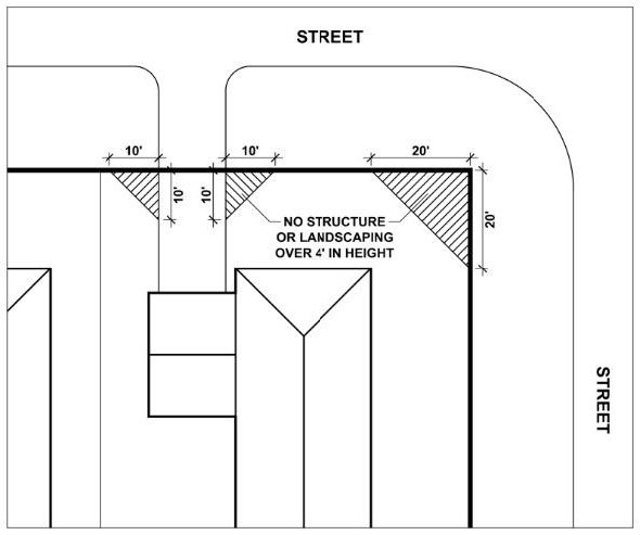 No fence, structure, building, hedge, berm or planting may rise over four (4) feet in height above the level of the public sidewalk within twenty (20) feet of any street right-of-way corner and ten (10) feet of any front property line where it will interfere with traffic or pedestrian visibility across the driveway, alley or street. See Figure 15-1: View Obstruction. This provision does not apply to buildings within the C-3, C-4 and C-6 Districts. However, all landscaping and signs within the C-3, C-4 and C-6 Districts must comply with view obstruction requirements.