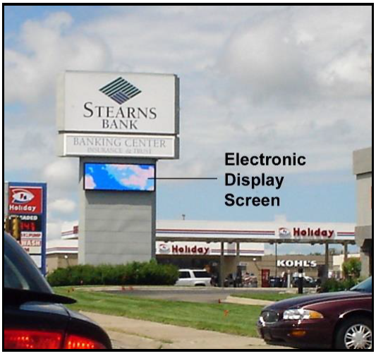 Electronic Display Screen. A sign, or portion of a sign, that displays an electronic image or video, which may or may not include text. This definition includes television screens, plasma screens, digital screens, flat screens, LED screens, video boards and holographic displays. See Figure 21-20: Electronic Display Screen.