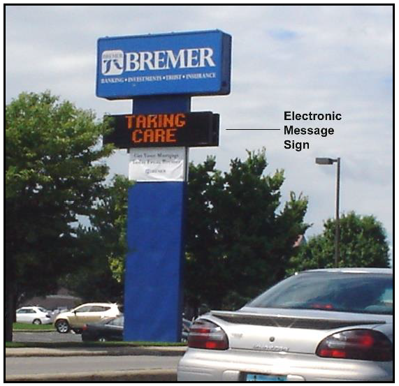 Electronic Message Sign. Any sign, or portion of a sign, that uses changing lights to form a sign message or messages in text form wherein the sequence of messages and the rate of change is electronically programmed and can be modified by electronic processes. Time and temperature signs are considered electronic message signs. See Figure 21-21: Electronic Message Sign.