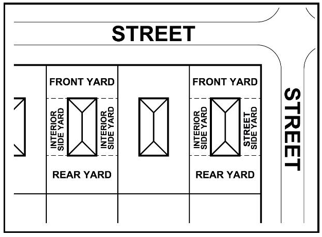 Yard, Street Side. A side yard on a corner lot that abuts a public street. See Figure 21-30.
