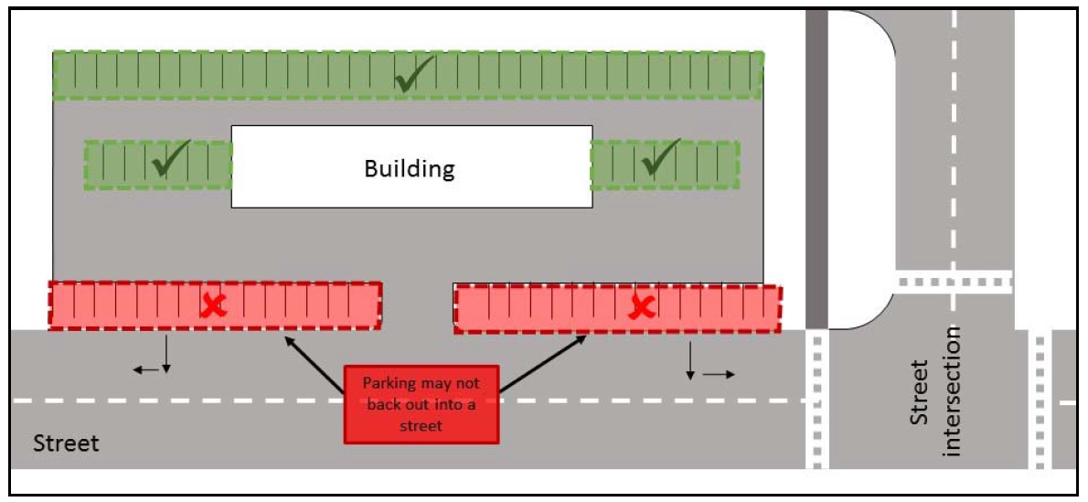 Parking spaces may not immediately back out onto any public rights-of-way or roads, as illustrated in figure 113-681(2) below: