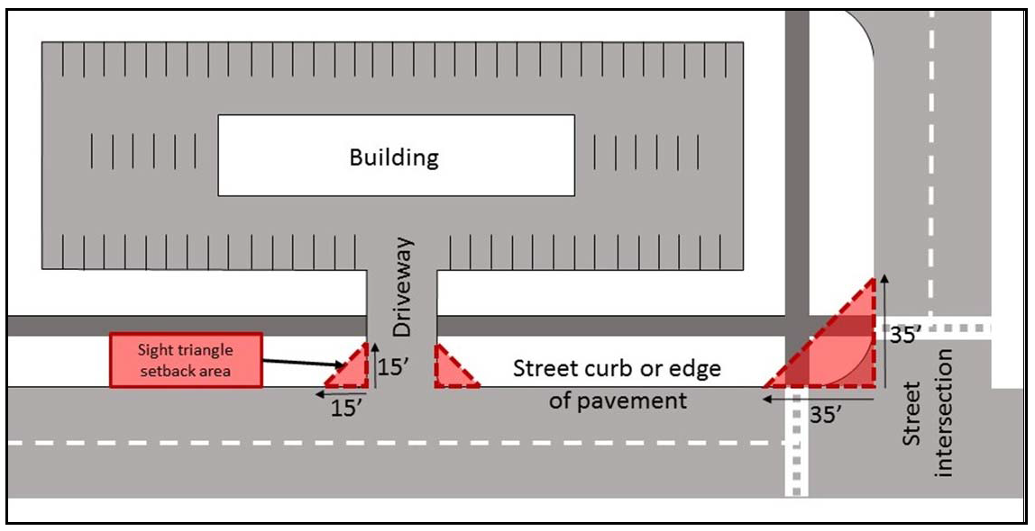 Parking spaces must observe a 15-foot sight triangle setback along the intersection of any public street or private accessway and a 35-foot sight triangle setback along any street intersection or site corner. Such sight triangles must be measured from the street curb or the edge of the pavement, whichever is nearest to the site, as illustrated in figure 113-681(3) below: