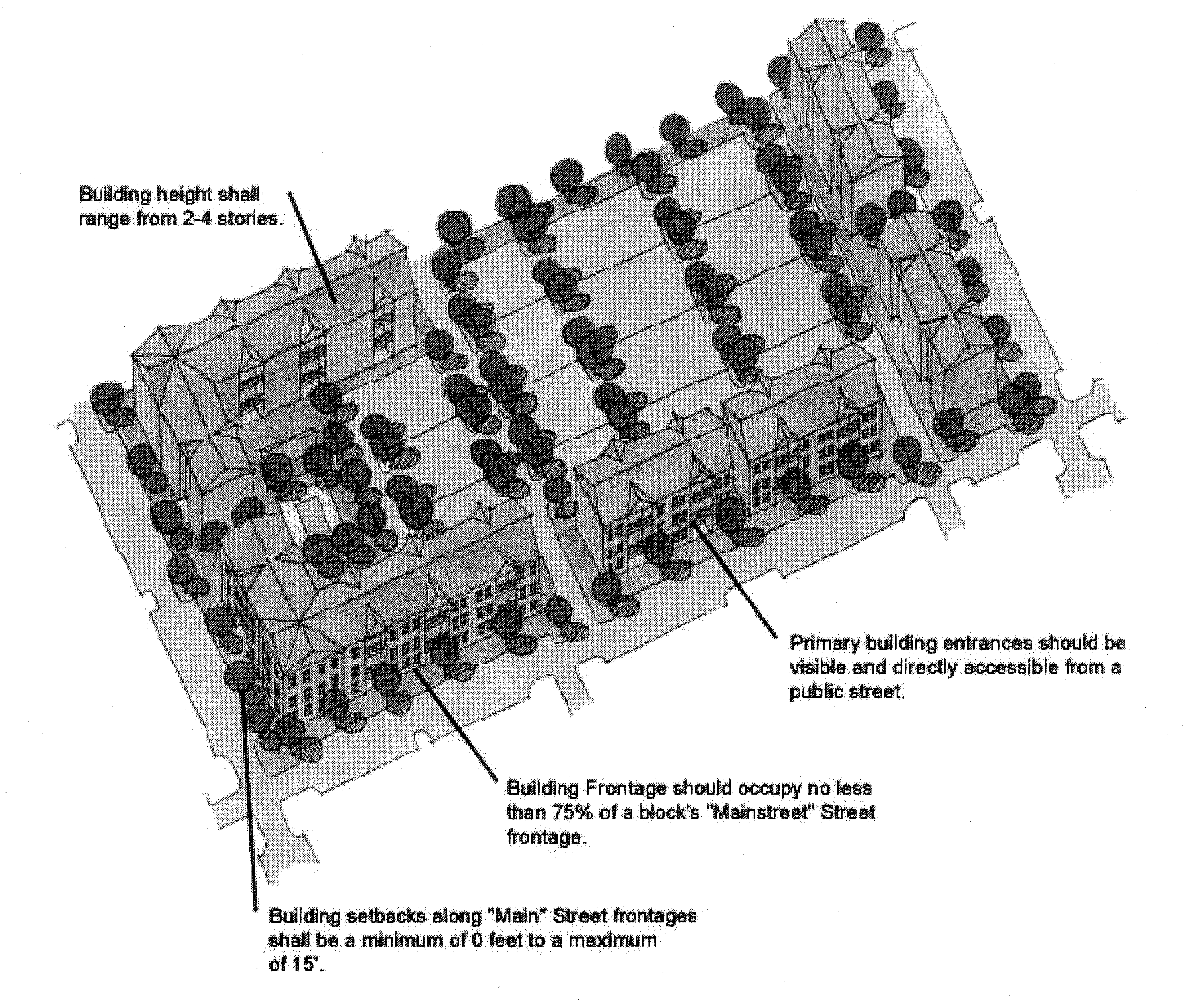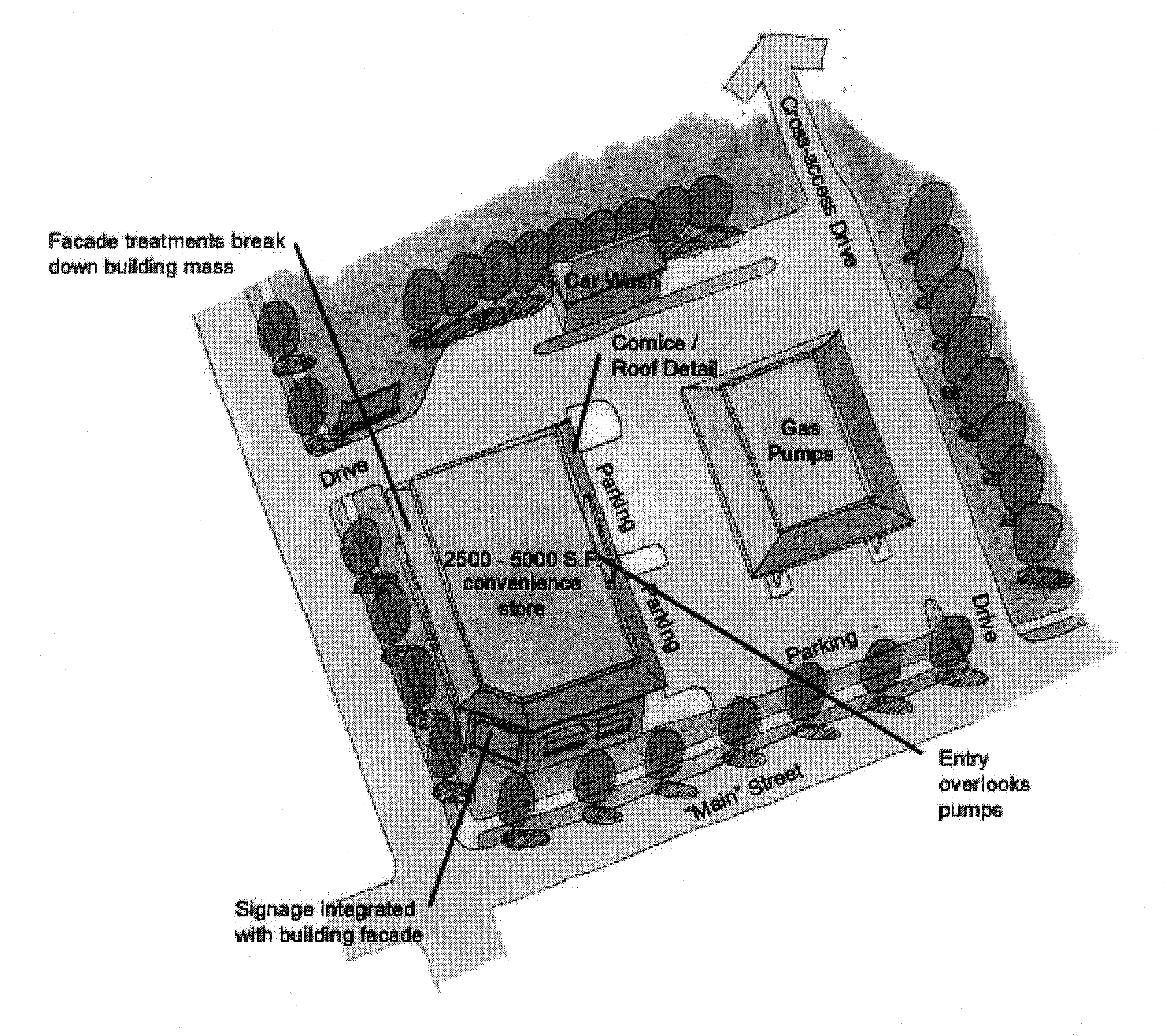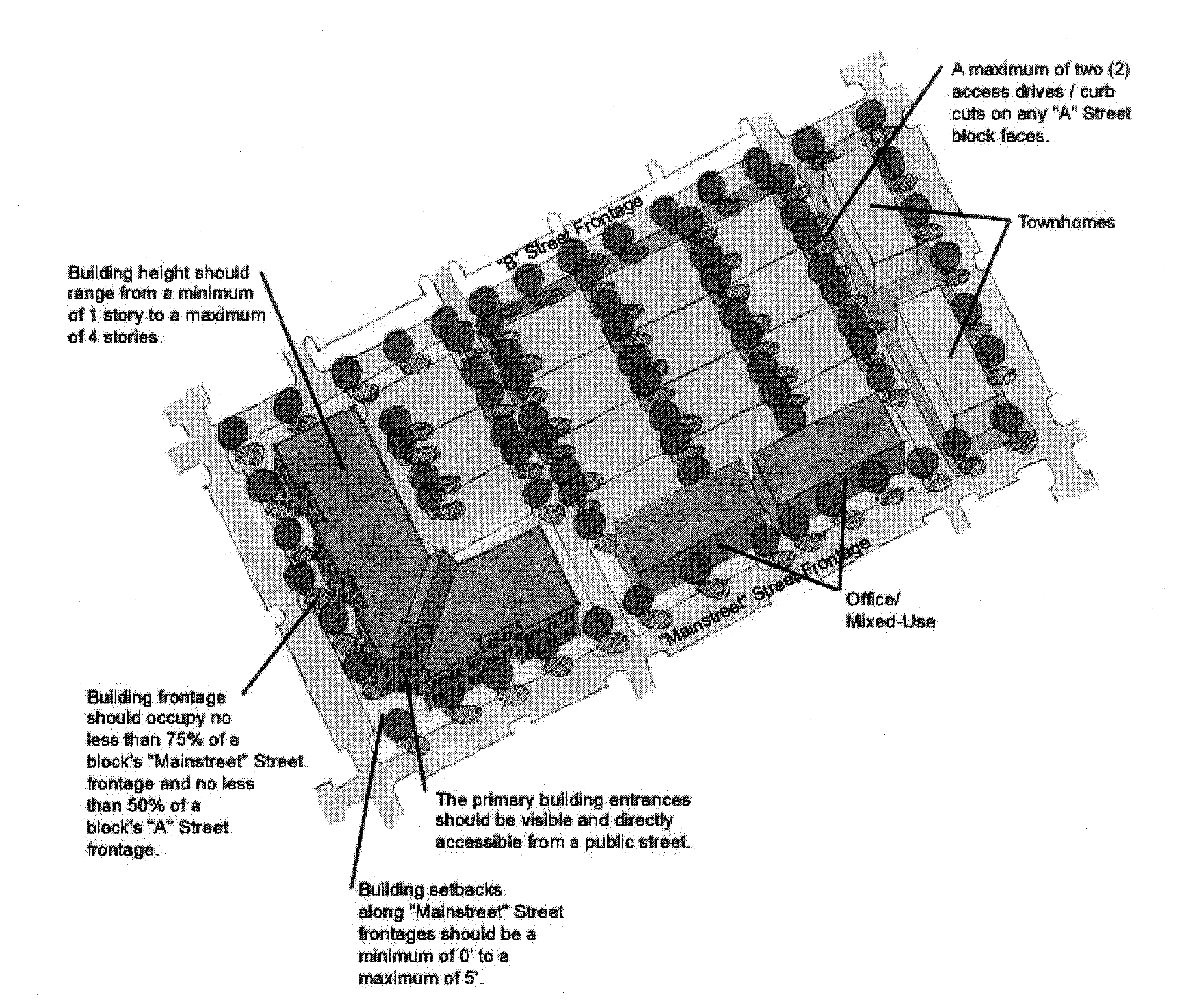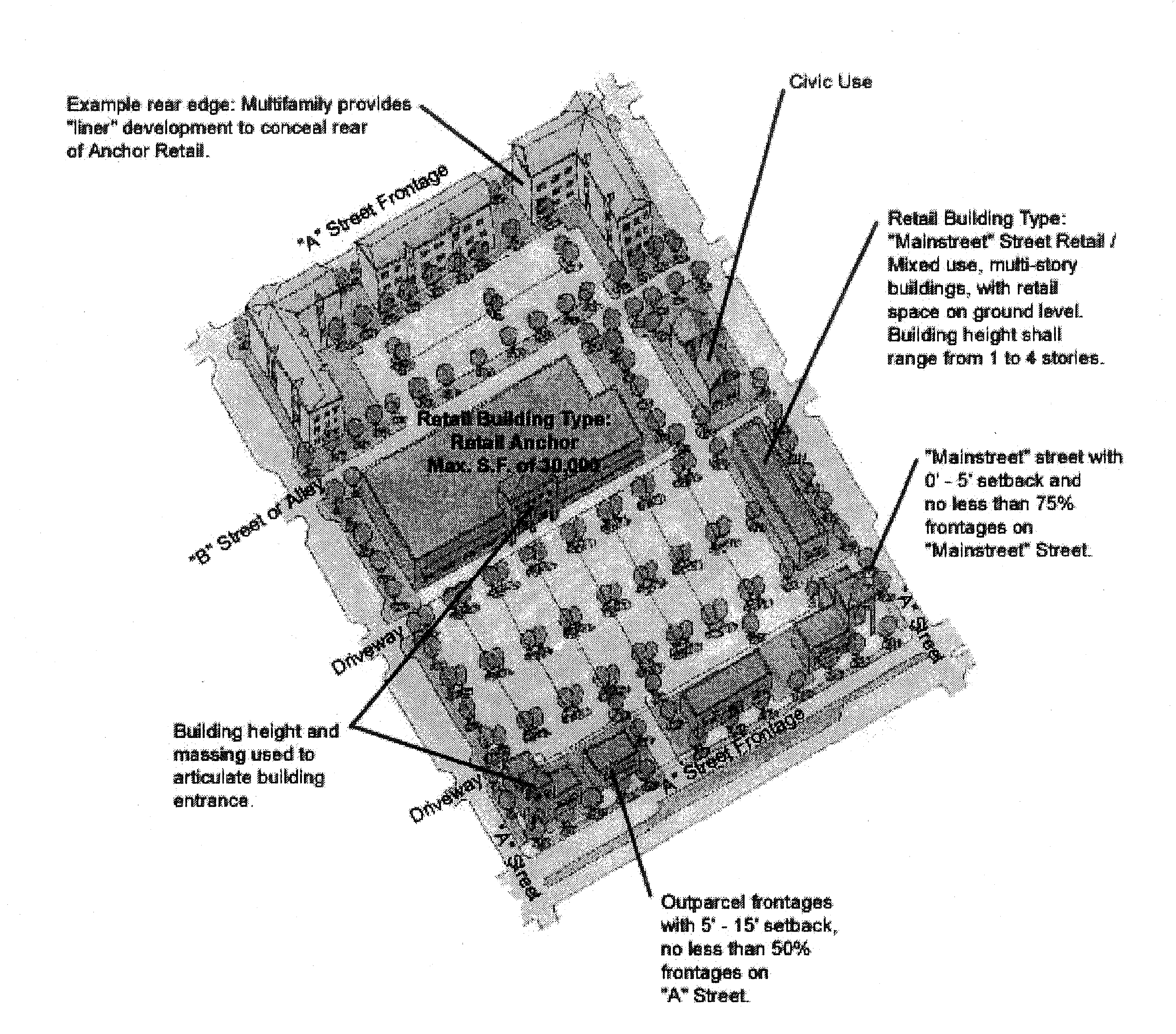 Development prototypes are intended to provide general guidance for the physical design of new projects within the Community Redevelopment District. These prototypes indicate general patterns for building placement, landscape configuration and the location of parking facilities and access points. The prototypes provide for consistency of site layout within a flexible framework which addresses the individual features of specific sites.