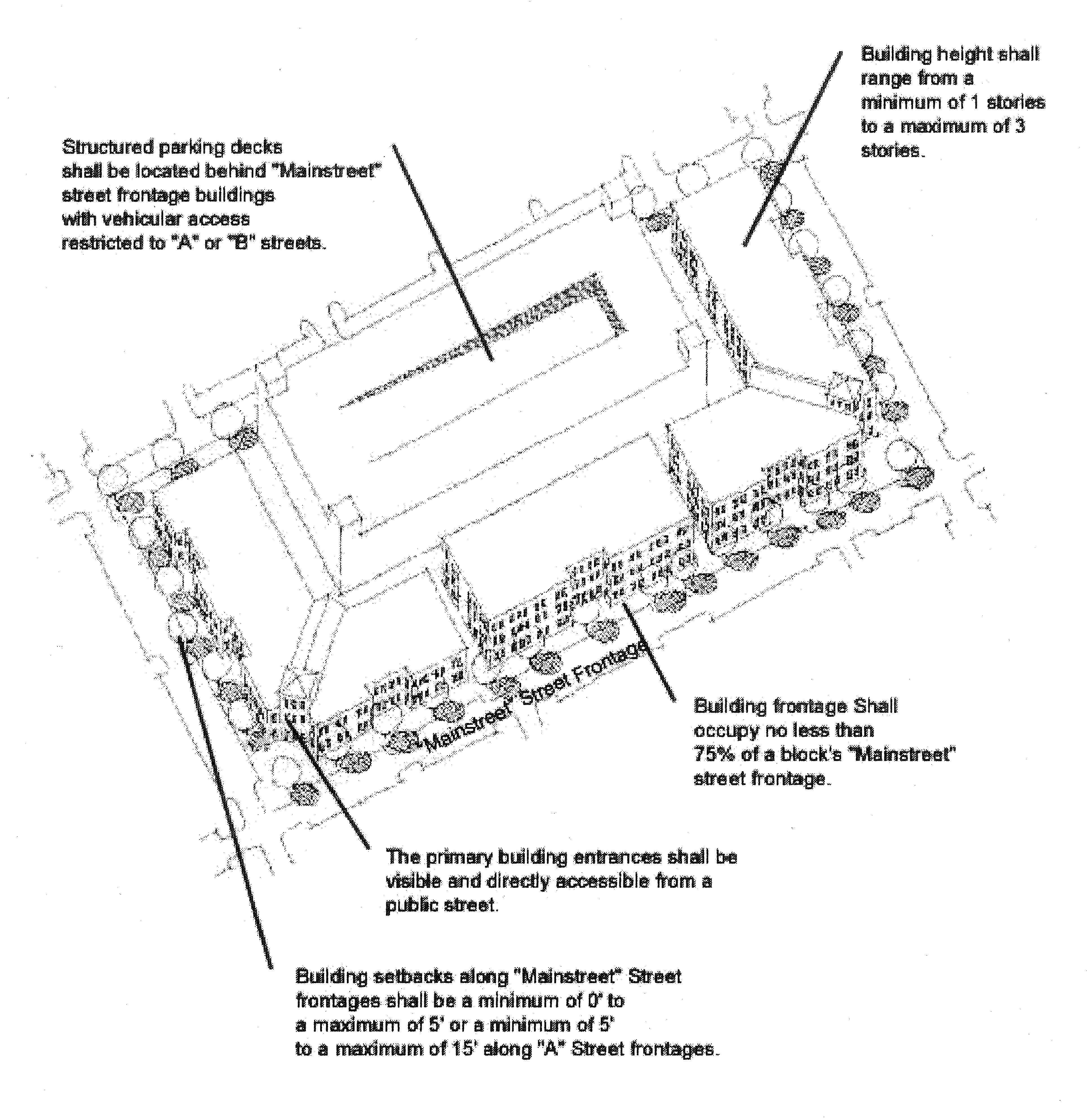 Development prototype structure. The development prototype structures are a series of figures that highlight some of the regulations. The prototypes are shown in a block format and individual parcel development may not be able to build to the form of a block. However, all development, at a minimum, will be expected to build to the building design, site design and lot layout. If development of an entire block occurs, the prototype shall be used as a development tool.
