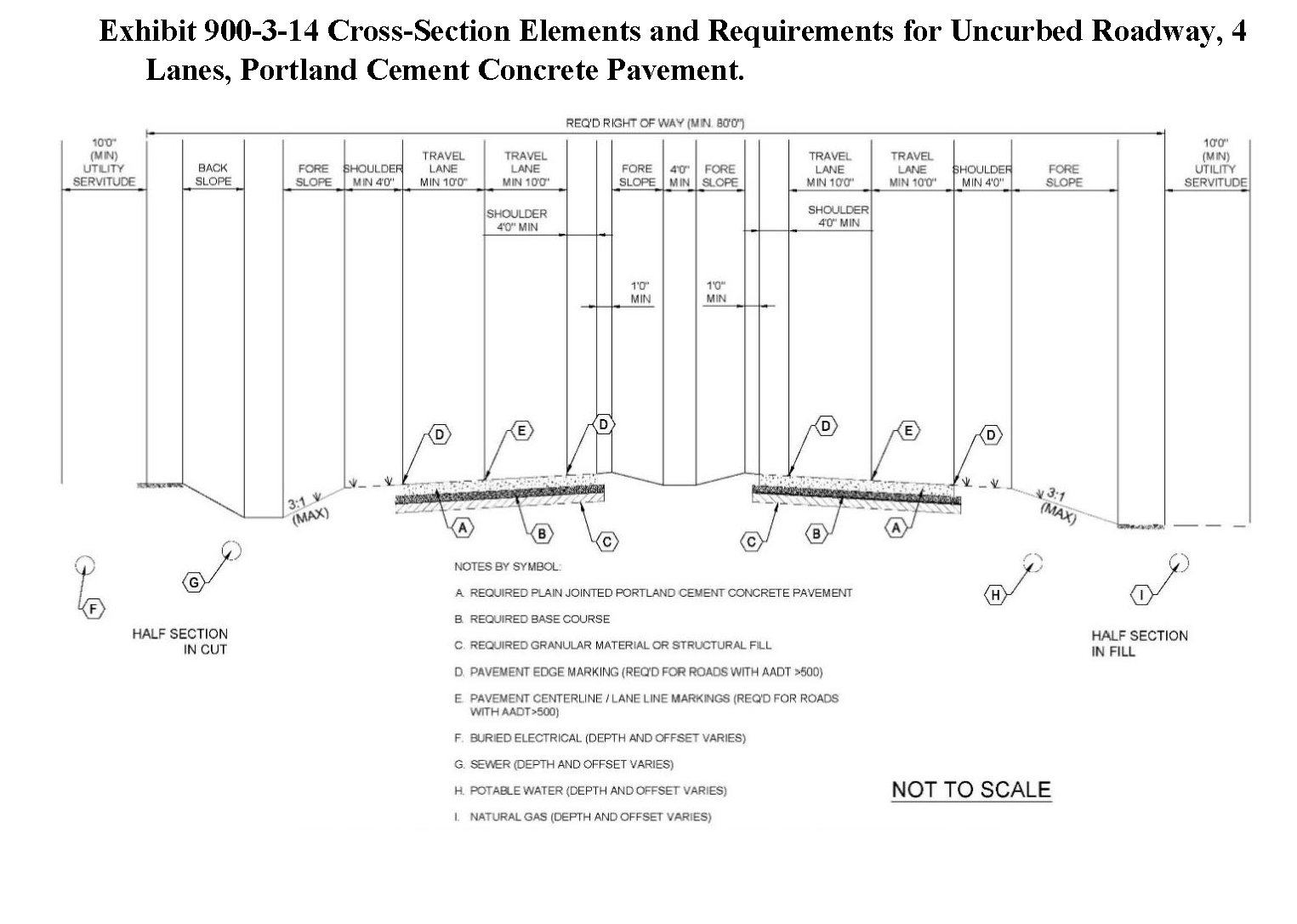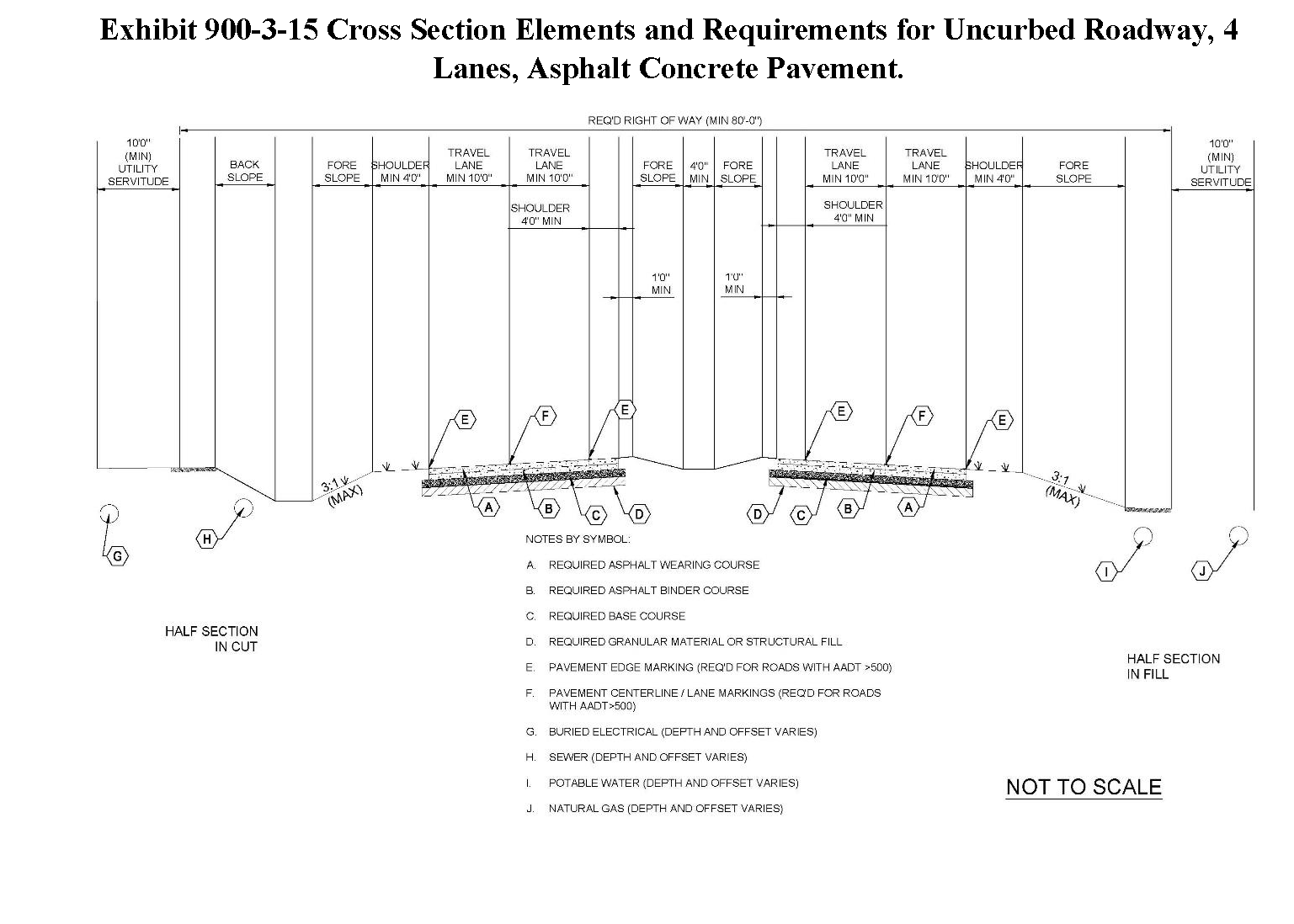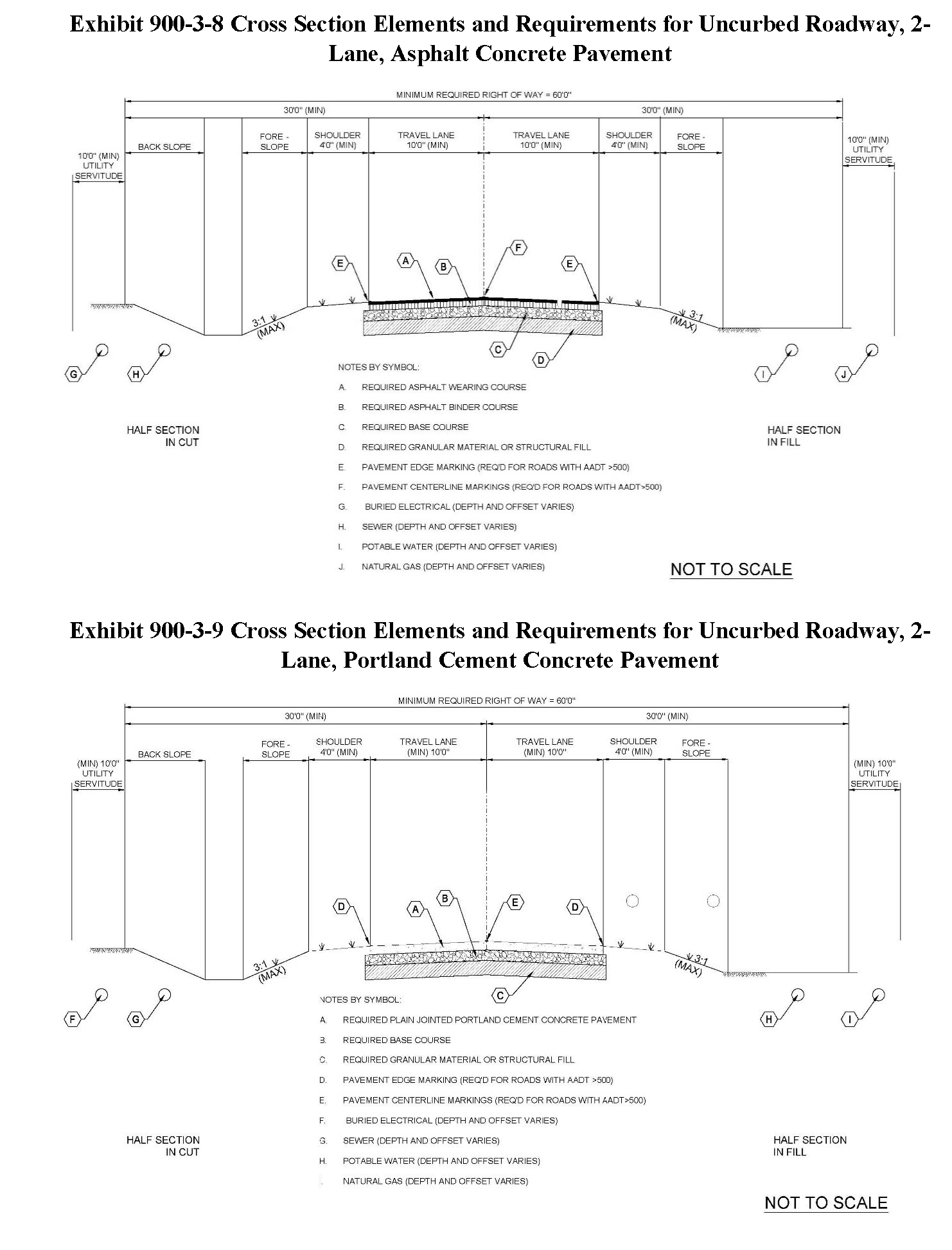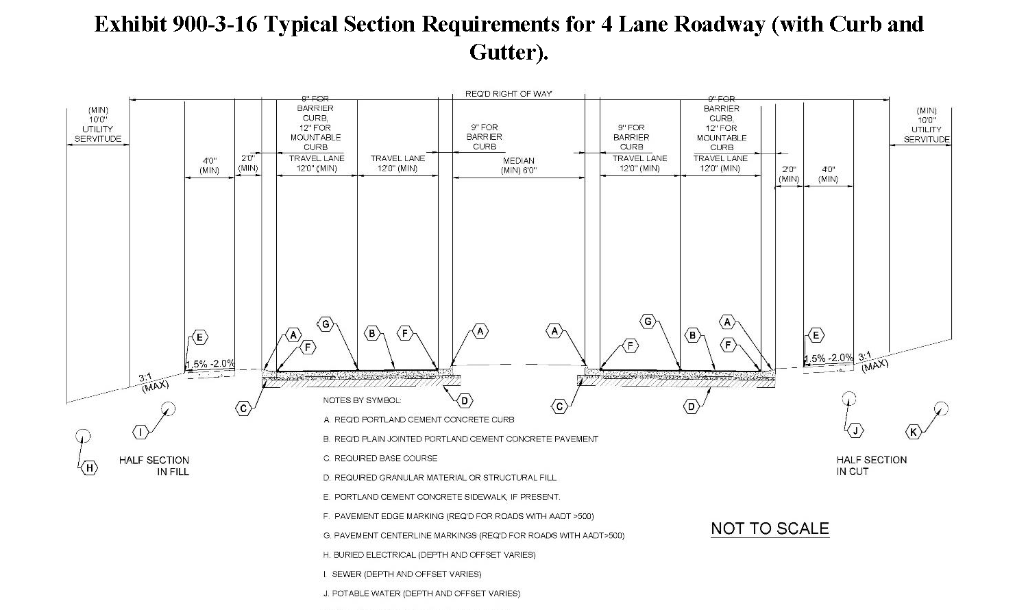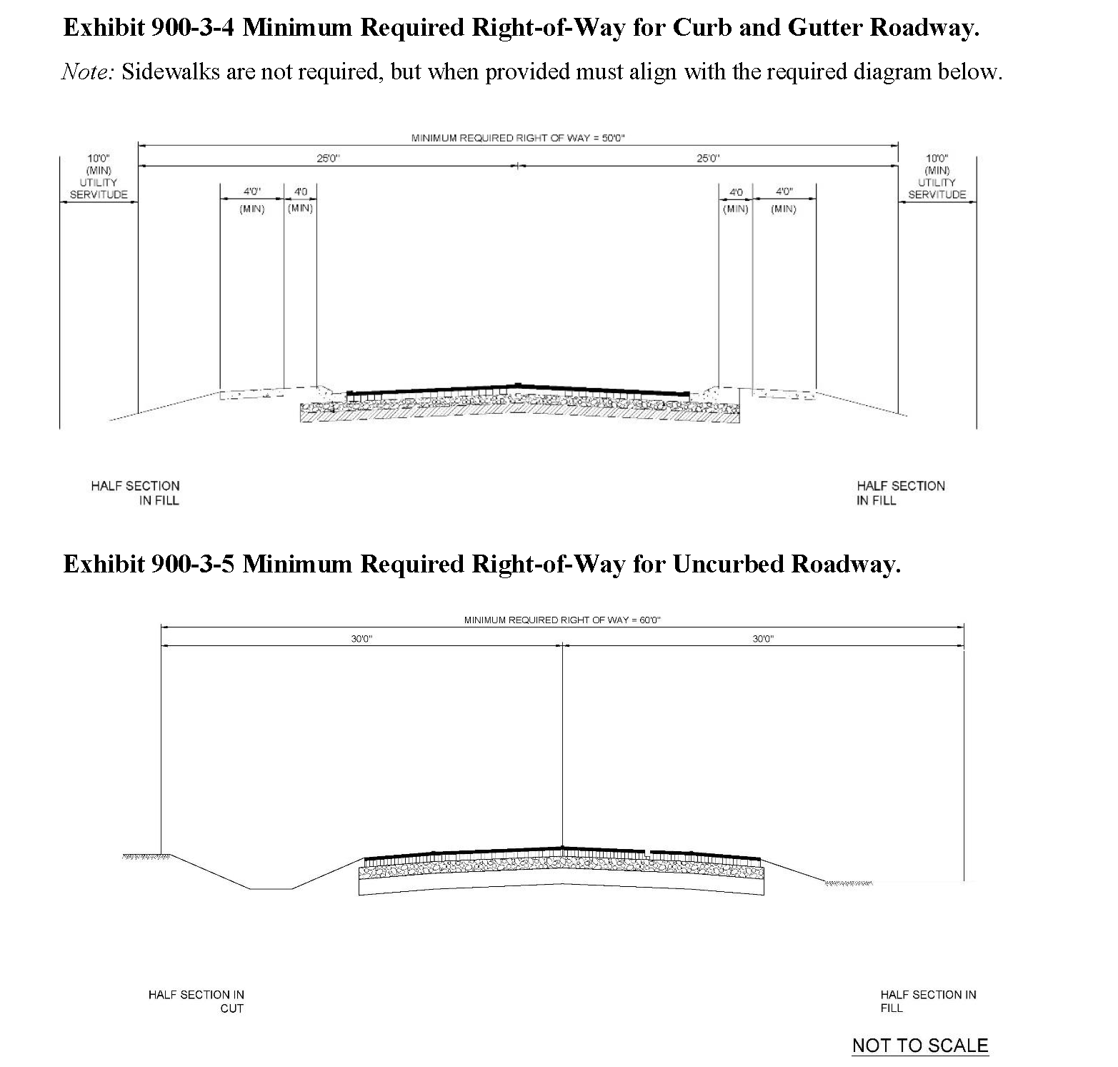 In general, gravity sewerage mains and force mains and valves shall be located between the right-of-way line and top of ditch or subsurface drainage feature. A horizontal clearance of minimum 3 feet shall be maintained between the top of ditch (or subsurface drainage feature) and edge of the gravity main, force main and/or valve. If the clearance requirement cannot be met due to field conditions, the Applicant shall coordinate with the Department of Public Works to determine an acceptable location of the main and/or the valve. Under no circumstances shall valves and their access be constructed in ditches or under subsurface drainage features.