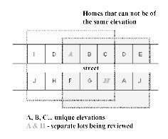 No Façade may be repeated within any adjacent lots or across the street from those lots within groupings of five homes;