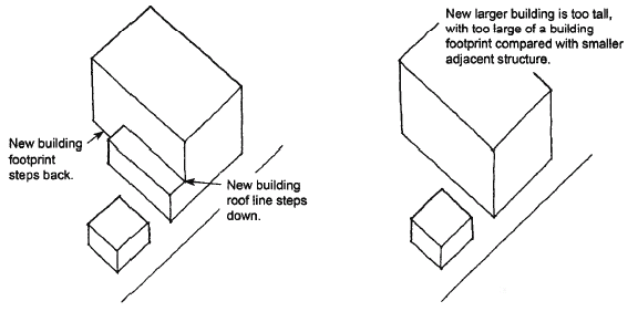 Building scale. Larger new buildings and building additions shall respect the scale of adjacent existing buildings by stepping down the height of the new building or building addition, and/or reducing the length of the building facade adjacent to the existing smaller structure. However, no stepping down of the height of the new building or building addition is required if the new building or building addition is less than two stories higher than the adjacent existing building(s).