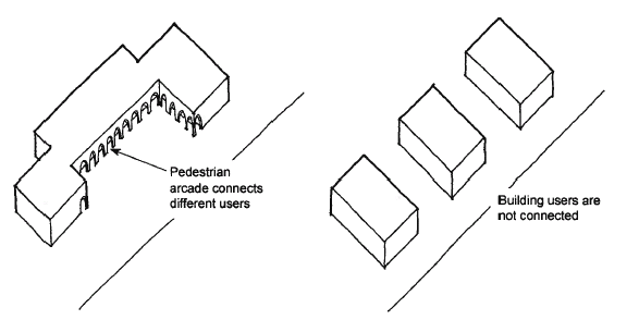 Cluster buildings to create pedestrian connections. Owners are encouraged to create pedestrian connections. Multiple buildings or tenant spaces within a single project or an integrated business development should create a positive functional relationship to one another and should be clustered to achieve a pedestrian scale. This creates opportunities for plazas and pedestrian precincts while preventing long box-like rows of buildings. A pedestrian link should be established between buildings with the use of an arcade system, trellis, colonnade, enhanced paving, building articulation and detailing, or similar features.