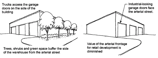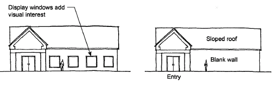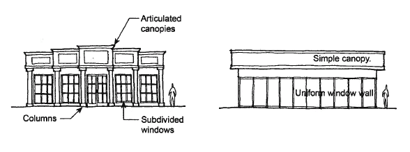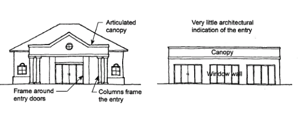 The purpose of the following design guidelines is to facilitate quality building design outcomes within nonresidential and mixed use districts. This is achieved by establishing standards that promote good design and a quality built environment. The graphics corresponding to each guideline illustrate the preferred standard of design (shown on the left) versus an unacceptable standard (shown on the right). Compliance with these guidelines shall be demonstrated by way of a site plan, in accordance with section 102-101 review of site plan.