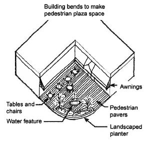 Pedestrian seating. Pedestrian-friendly spaces shall be promoted by arranging building massing to form outdoor plaza areas for dining or gathering. Elements to increase pedestrian comfort may include, but is not limited to, seating, tables, planters, landscaping, canopies, and low intensity light fixtures.