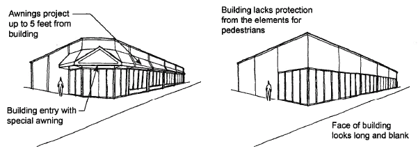 Awnings and canopies. Exterior weather protection is encouraged for building facades that are adjacent to sidewalks or pedestrian areas. Awnings or canopies should not extend from the building facade more than eight feet so as not to unnecessarily obstruct natural sunlight from the walkway and display windows. Arcades may extend to a greater width but must include artificial lighting. A maximum of one color shall be used for all canopies/awnings on a single building facade (excluding business logos). Alternatively, more than one color may be used provided the same scheme is used consistently along a single building facade. Canopies/awnings shall be integrated into the building's architecture.