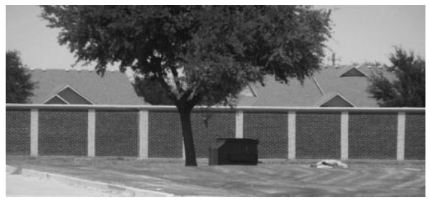 Rear walls. Not less than 70 percent of any exposed exterior wall forming the rear of a building or structure, exclusive of windows, doors, roofs, or sidewalks and walkway covers, shall be constructed with a rectangular smooth or textured split-face block bonding shape pattern or flat textured or dimpled appearance.
