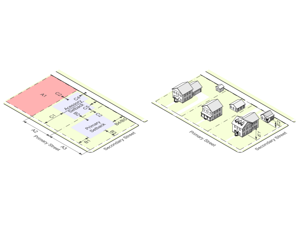 C5 Rear setback adjacent to alley for garages (min.) | 7’ without parking, 18’ with parking |