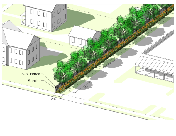 | Parking lots adjacent to a street with more than four (4) parking spaces shall be screened from view from the street by a building or brick masonry wall at least four (4) feet in height or a decorative wood fence at least four (4) feet in height planted with evergreen shrubs three (3) feet in height at time of planting. | -- | -- | -- | -- | -- | -- | -- | -- | -- | -- | -- | ⬜ | -- | -- | -- | -- | -- | -- | ⬜ | -- | -- | -- | -- | -- |