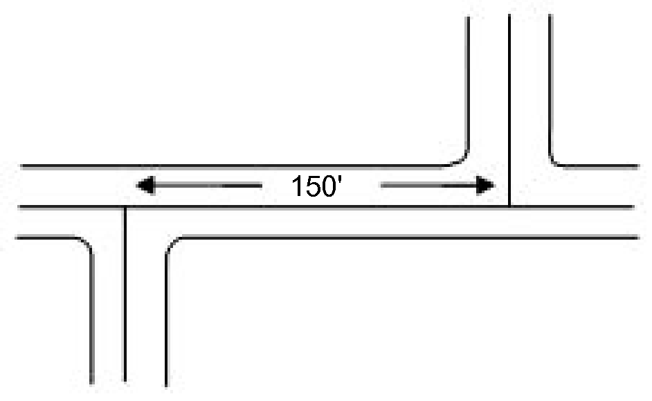 When streets parallel to the railroad right-of-way intersect a street that crosses the railroad right-of-way at grade, they shall, to the extent practicable, be at a distance of at least one hundred fifty (150) feet from the railroad right-of-way. Such distance shall be determined with due consideration of the minimum distance required for future separation of grades by means of appropriate approach gradients.