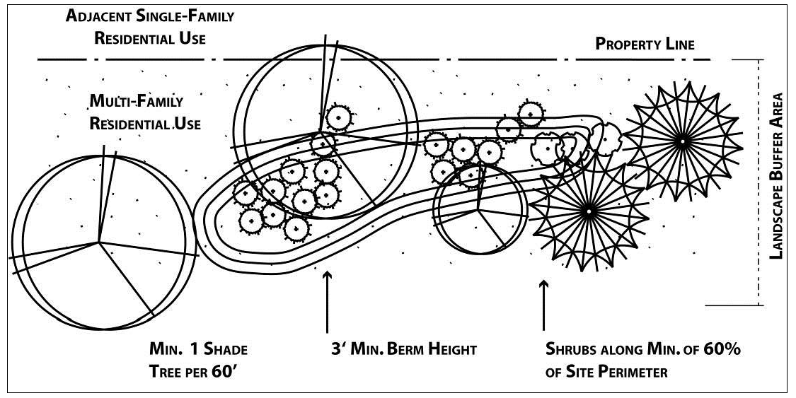 Screening between single- and multi-family residential uses. This landscape screening is generally required between single- and multi-family residential areas. Berming, trees, and shrubs shall be provided to create a visual separation between properties. Appropriate berm height will depend on the width of the landscape area, with no berm having a slope greater than 3:1. A minimum of 60 percent of the length of the perimeter shall be planted with shrubs that will reach a height of at least six feet. Trees shall be provided in a quantity equal to one tree per 60 feet of perimeter length. Tree spacing shall be determined by tree species and design considerations. Up to 25 percent of the required trees in this screening alternative may be small deciduous trees.