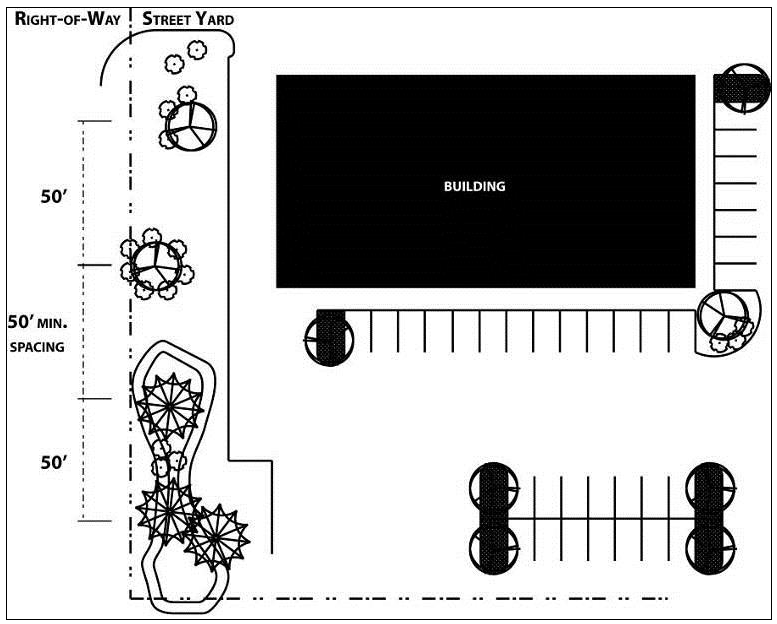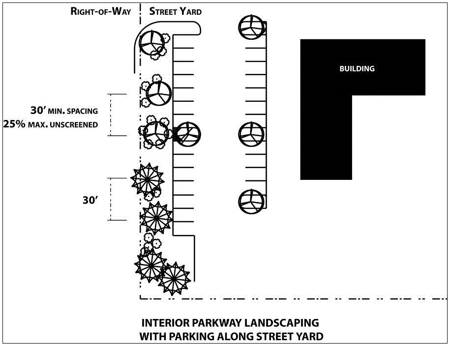 No parking located along street yard. One tree per 50 feet of street frontage shall be provided. At least 50 percent of the required trees shall be appropriately sized or evergreen trees as identified in the recommended trees, shrubs, evergreen, and ground cover list. Tree type may vary depending on design intent. The remainder of the interior parkway shall be planted with shrubs, ground cover, flowers, or grass.