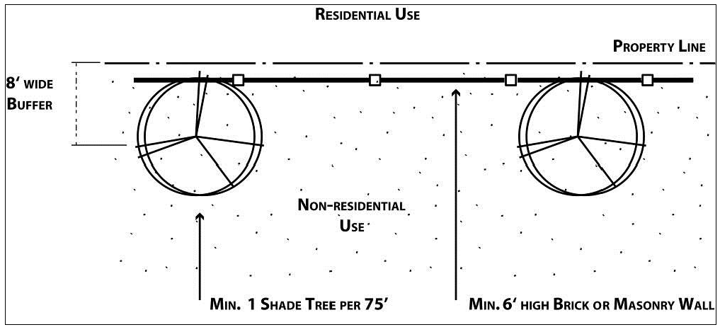 Alternative A. The buffering area shall be a minimum of eight feet in width for this alternative. An opaque brick or other approved decorative masonry wall six feet high shall be constructed along the entire perimeter, excluding area within the required front yard setback. The wall may be continued within the front yard provided the height is reduced to four feet. Appropriately sized trees in a quantity equal to one tree per 75 feet of perimeter length shall be provided. Tree spacing shall be determined by tree species and design considerations, and are not required to be evenly spaced.