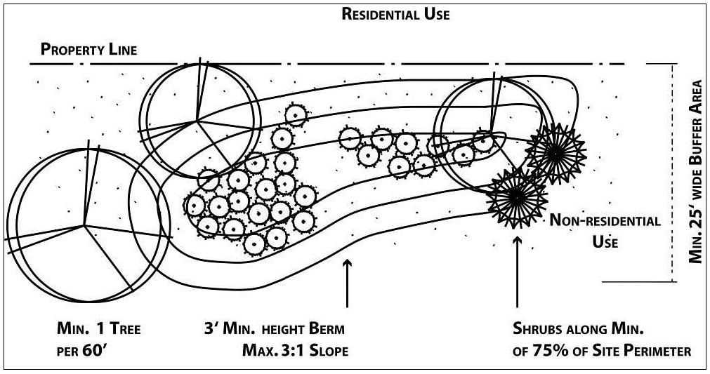 Alternative C. A minimum 25-foot buffer area shall be required for this alternative. A berm at least three feet in height with a maximum 3:1 slope shall be constructed along the entire perimeter. Breaks in the berm may be provided as appropriate to accommodate drainage. The berm shall be planted with shrubs four feet or greater in height to provide screening along at least 75 percent of the perimeter length. Trees shall be provided in a quantity equal to one tree per 60 feet of perimeter length. Tree spacing shall be determined by tree species and design considerations. Up to 25 percent of the required trees in this screening alternative may be small deciduous trees.