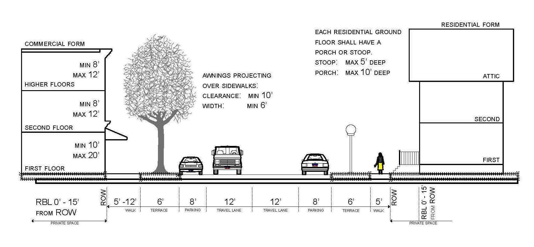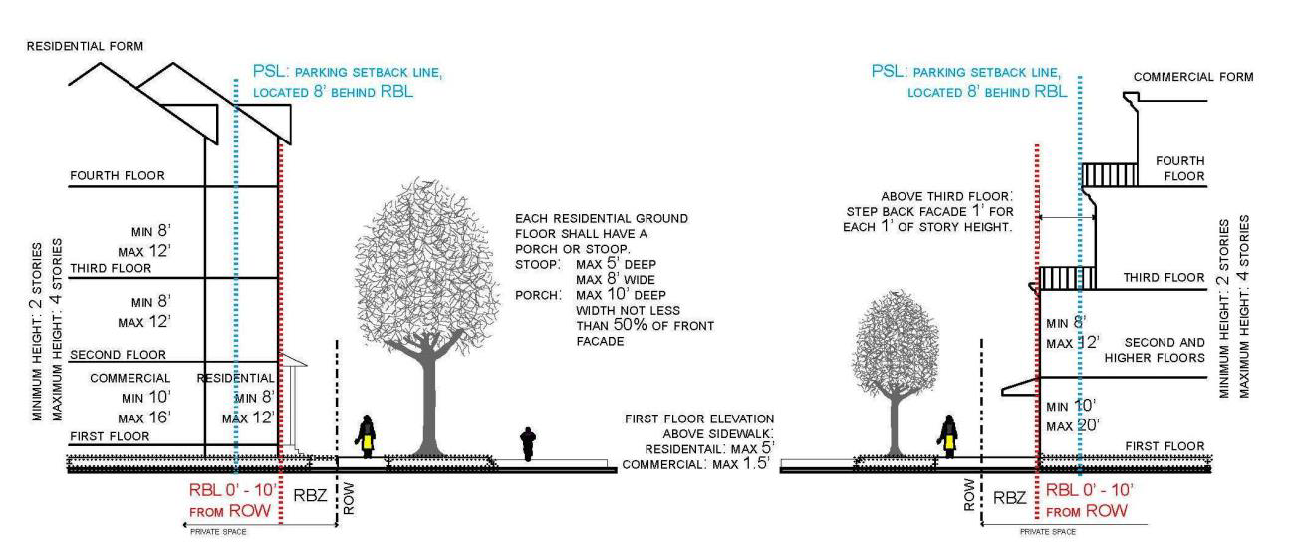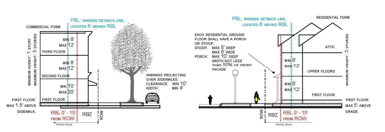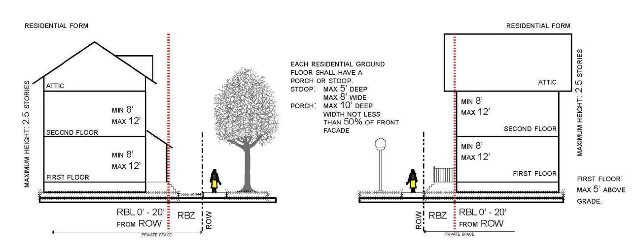 The building form standards establish basic parameters governing building form, including the envelope for building placement (in three dimensions) and certain permitted/required building elements, such as window and door openings, porches and stoops, balconies, and street walls. The building form standards establish both the boundaries within which development may occur and specific elements that may or shall be present. The applicable standard for a building is determined by its sub-district, as identified on the regulating plan. This produces a coherent street-space and allows the building greater latitude behind its street façade.