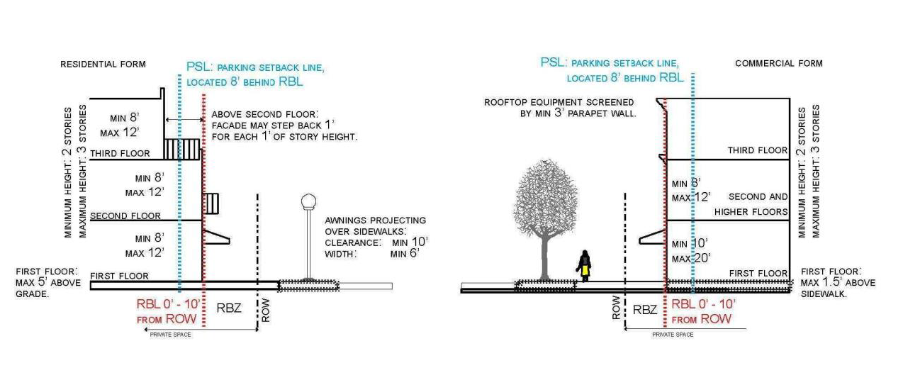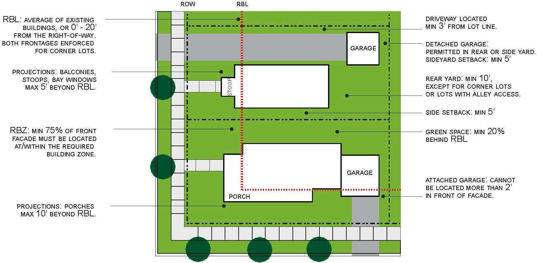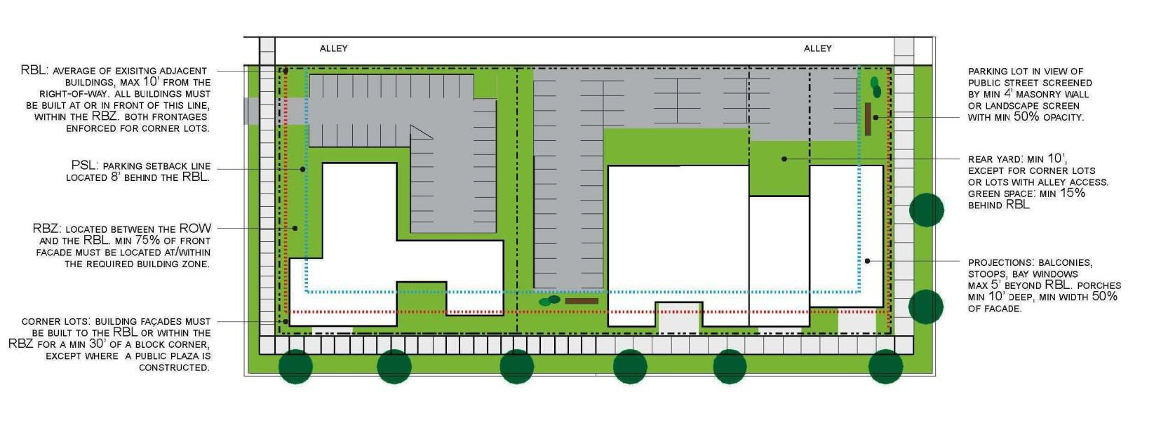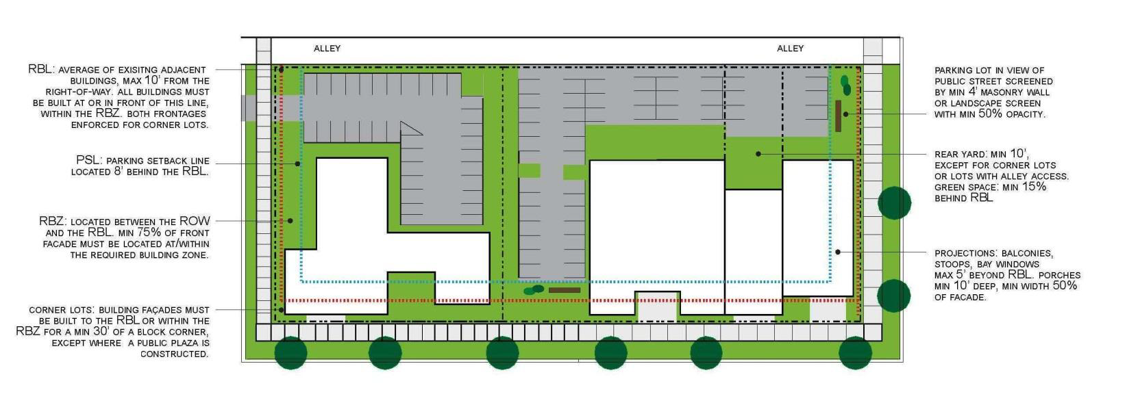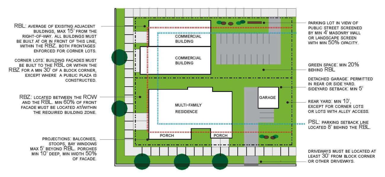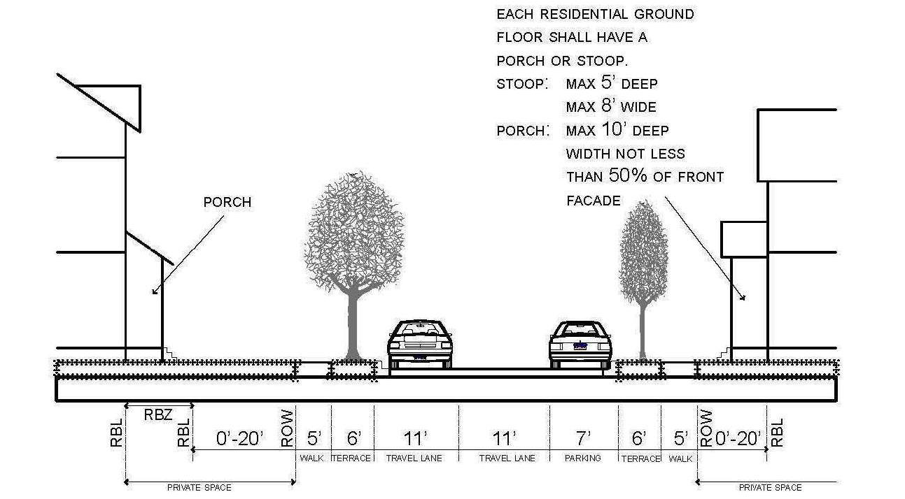 The front façade required building line exists within a prescribed zone defined by distance from the public right-of-way. In this way, building placement within each sub-district is coherent and agreeable, but not regimented to the degree that the effect is of a contrived, sterile, themed or highly planned development. This prescribed zone is based on the existing framework of a traditional urban neighborhood oriented to the pedestrian, and not a suburban environment oriented to motorized transportation.