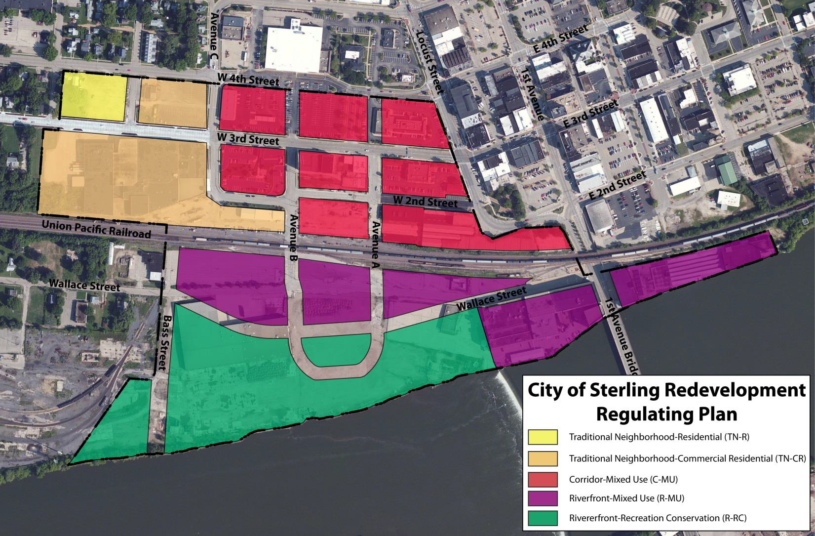 Regulating plan. The regulating plan is the coding key for the form district and serves as a public space master plan referring the reader to specific information on prescribed development for each sub-district within the district. Building on the results of the Riverfront Redevelopment Plan and the comprehensive strategic plan, a regulating plan has been produced for the Sterling Redevelopment Form District. Sub-districts reflect unique context, locational considerations, and desired future form and function of the public realm.