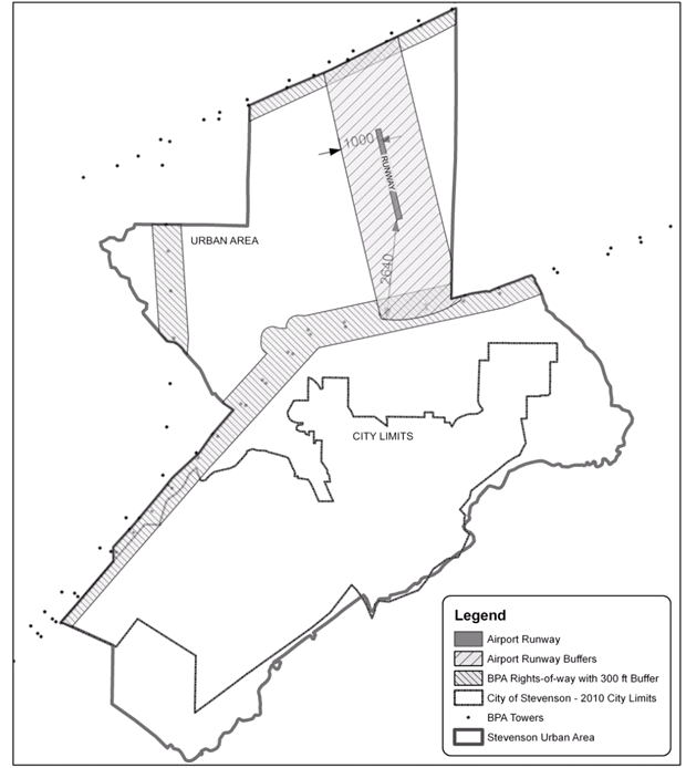 The provisions of this chapter shall apply to all areas within a BPA right-of-way or easement or within three hundred feet of a BPA right-of-way or easement; provided however, that this overlay district shall not apply within one-half mile from the end of and at least one thousand feet from the sides of any runway available for public use and identified on the most current edition of the Sectional Aeronautical Charts produced by the National Aeronautical Charting Office (NACO).
