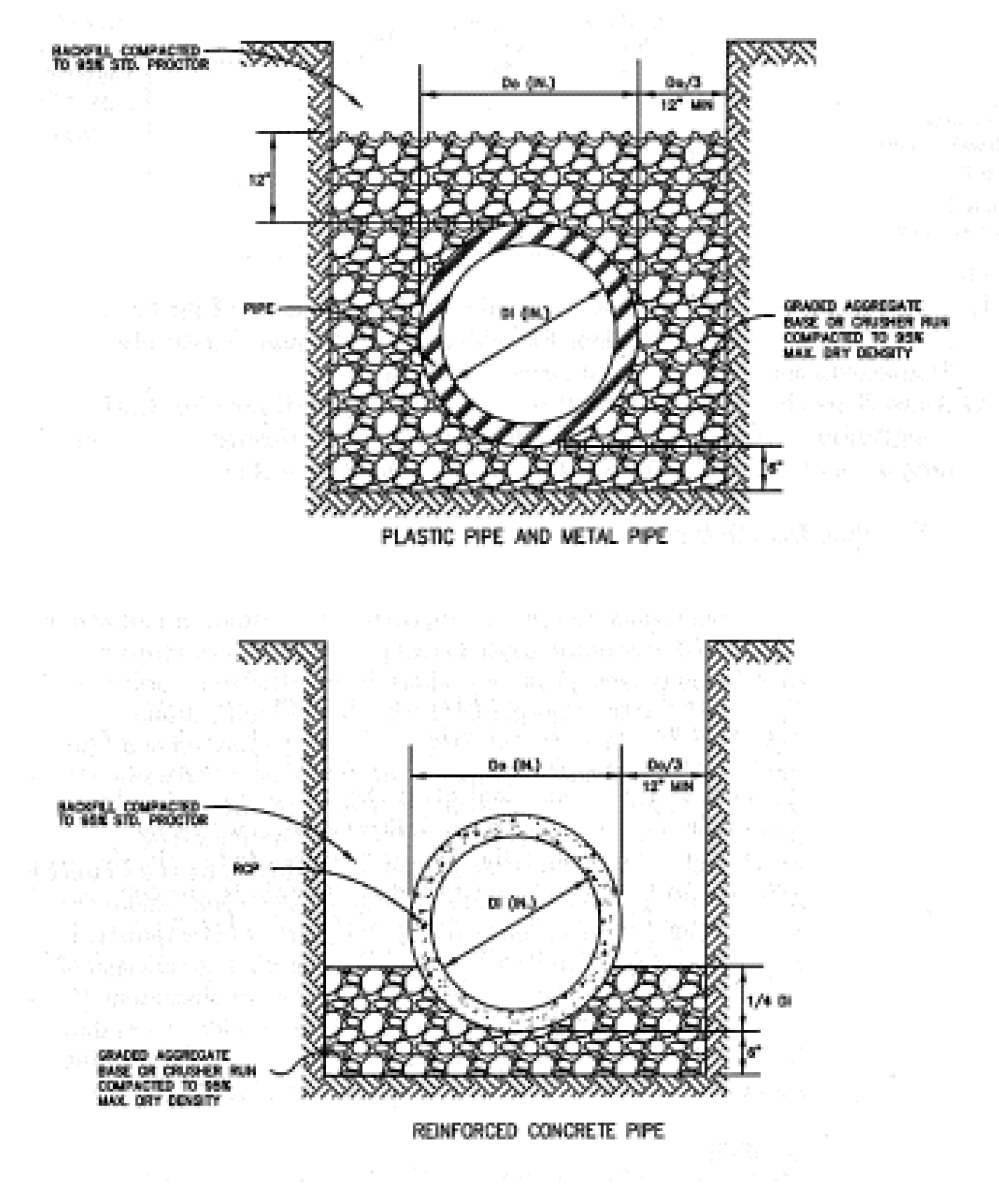 Backfilling. Backfill for CSP, CAP, and HDPE pipe installations shall be constructed using graded aggregate base or crusher run six (6) inches below the bottom of pipe to twelve (12) inches above the pipe crown. Backfill for RCP pipe installations shall be constructed using graded aggregate base or crusher run six (6) inches below the pipe invert to one-quarter (¼) of the pipe diameter. Foundation backfill material shall be used for RCP above one-quarter (¼) of the pipe diameter (if graded aggregate base is not used above the one-quarter (¼) of the pipe diameter) as per Type I or Type II, as specified in Georgia DOT Standard Specifications. These materials shall be placed in players of no more than six (6) inches loose. Compaction of these materials shall be accomplished by hand tamping or machine tamping. Required compaction levels are as follows: