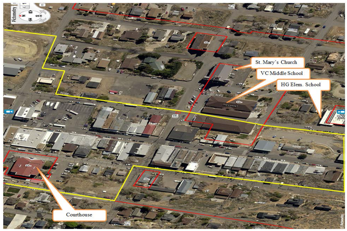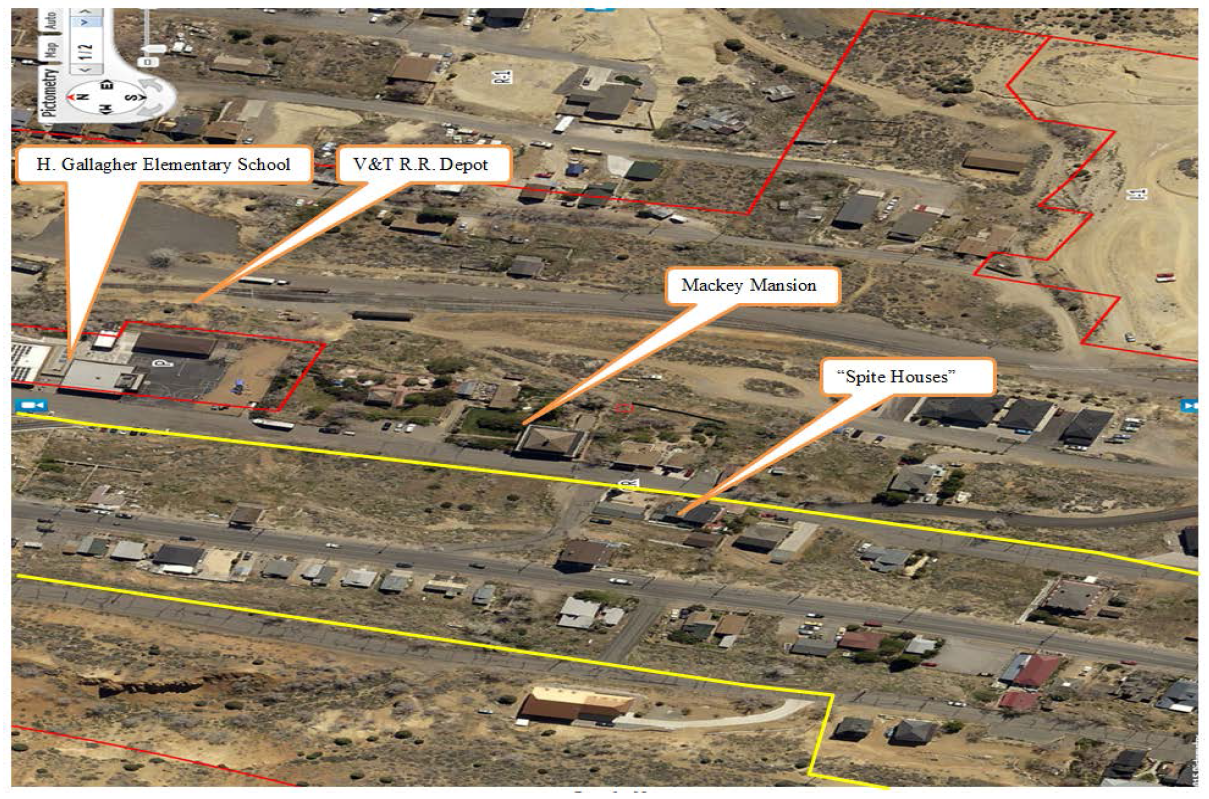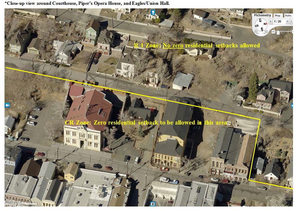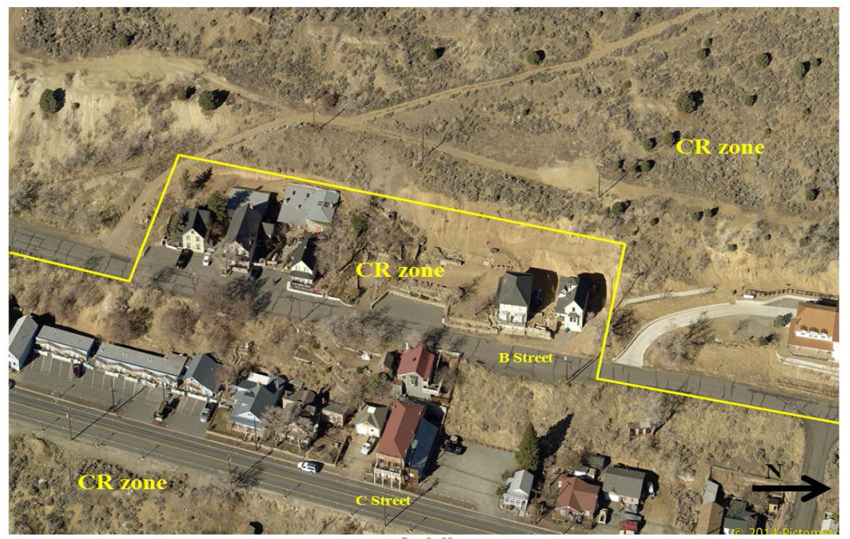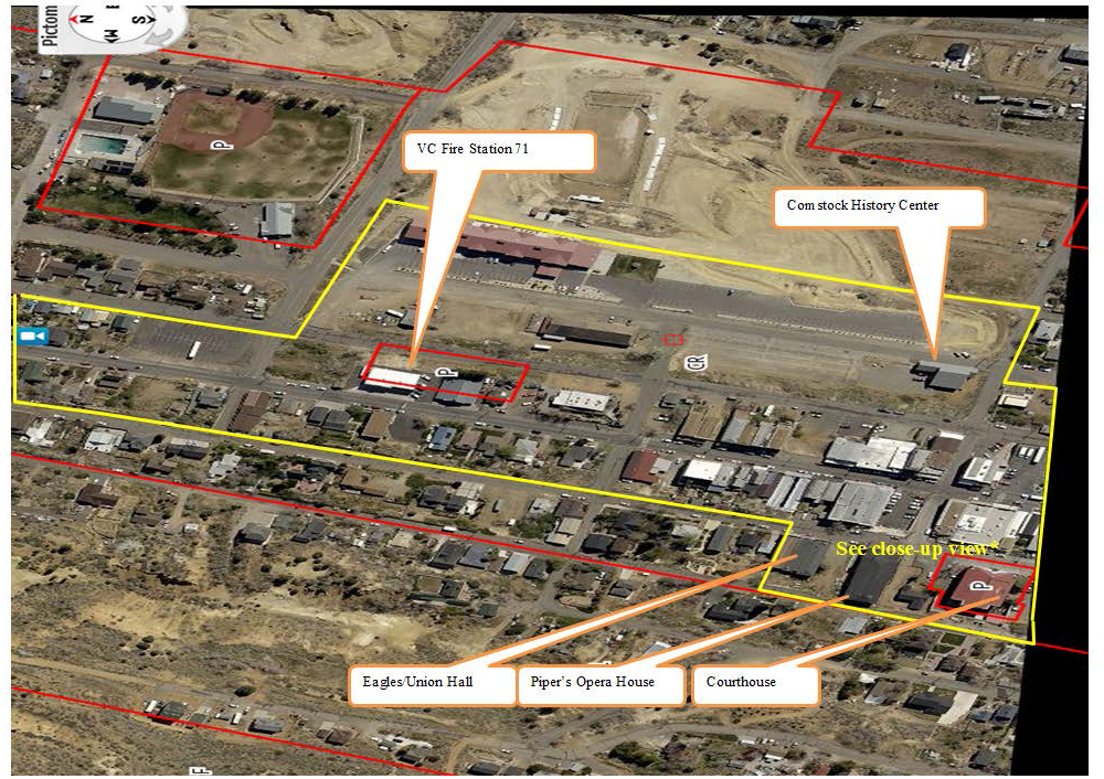 The "Virginia City Downtown District" (area inside yellow boundary line shown below) includes all parcels shown below, in which a pattern of historic higher-density and mixed-uses are found. The information shown below is approximate and does not represent survey delineation and should not be construed as a replacement of authoritative sources, zone maps, plat maps, deeds, resurveys, etc.