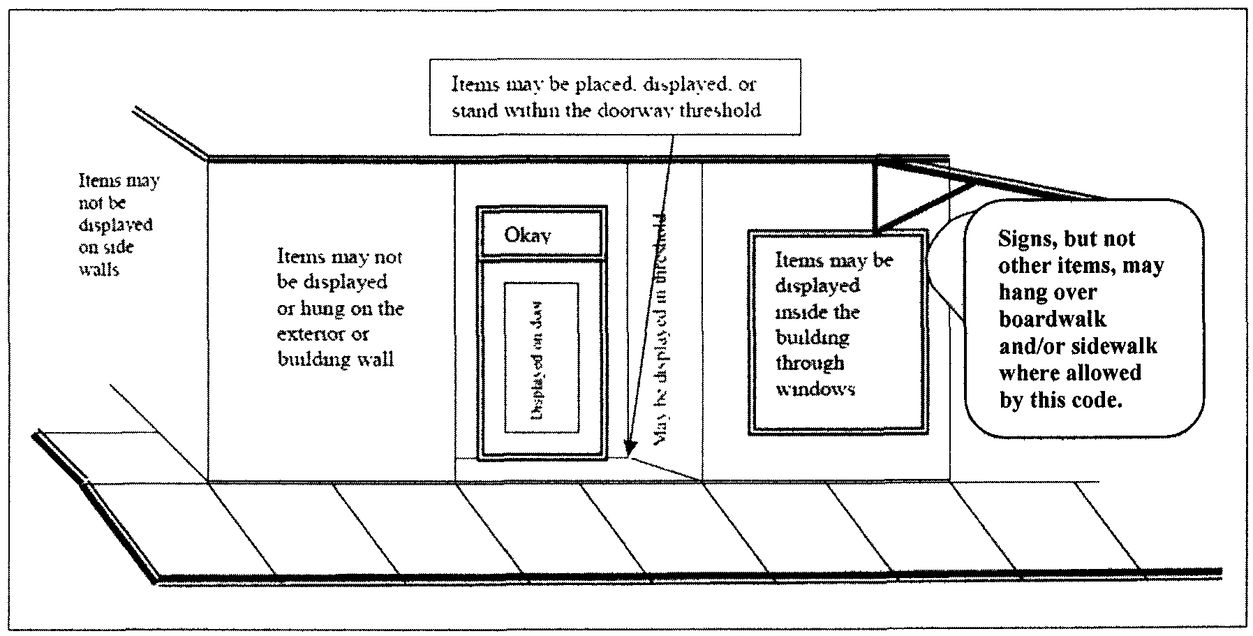 In zones where a commercial business is allowed, a special use permit is required for the display, sale, barter, or trade of items outside of a permanent building, except for permitted temporary uses and farmer's markets. A business may not display items for sale or conduct any business on the public right-of-way (See Figure 12.9) or between the public traveled way and building, such as on the boardwalk/sidewalk. Business, including dining, customer seating, and other uses, but not the display of merchandise and other items for sale, barter, or trade, may occur in the front, side, and rear yards of the business where such area exists. Recessed door openings and thresholds may be used to display items for sale, barter, or trade and to otherwise conduct business.