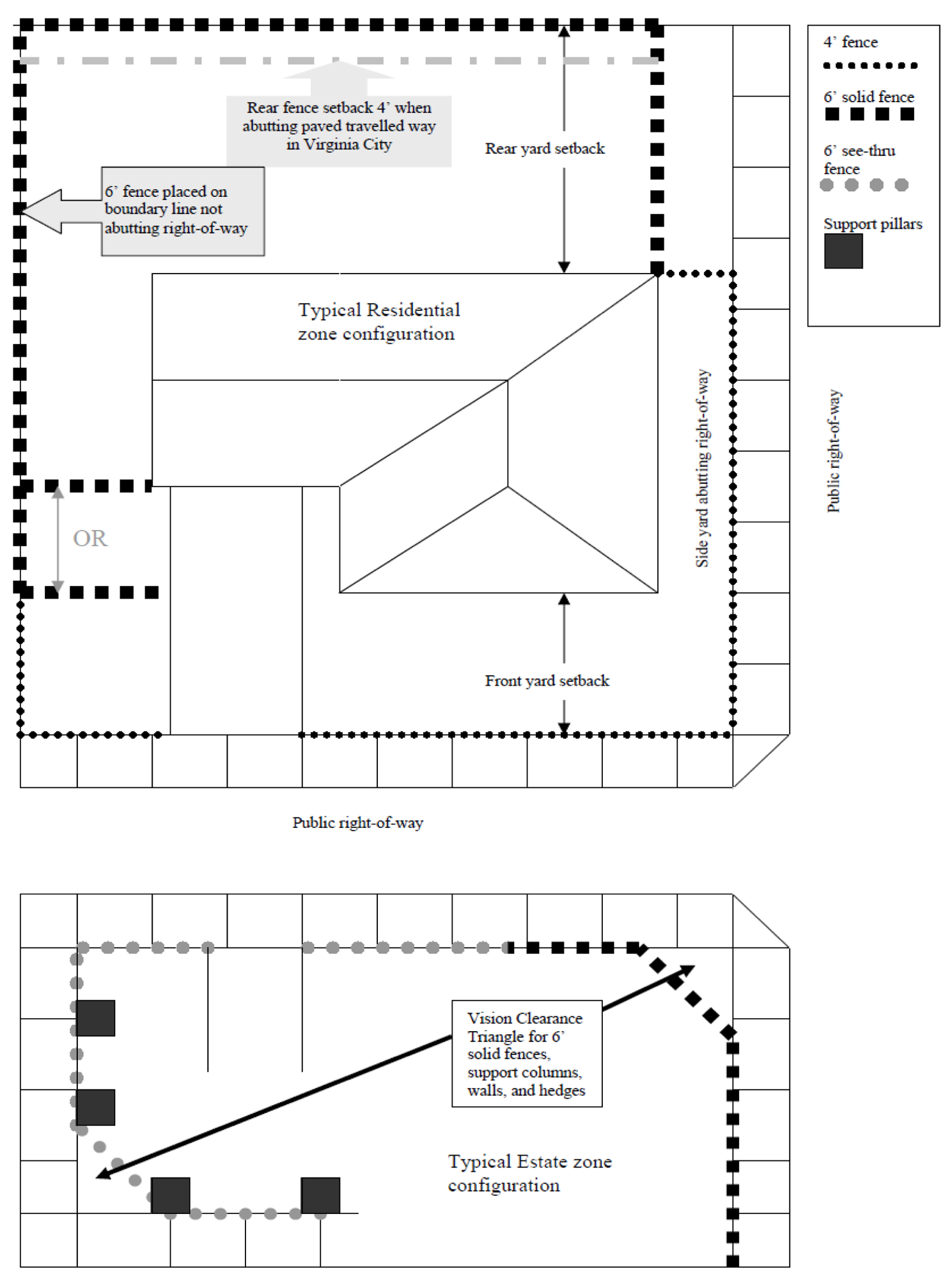 may not. The six-foot fences (bottom) may abut the front lot line of the E and R zones