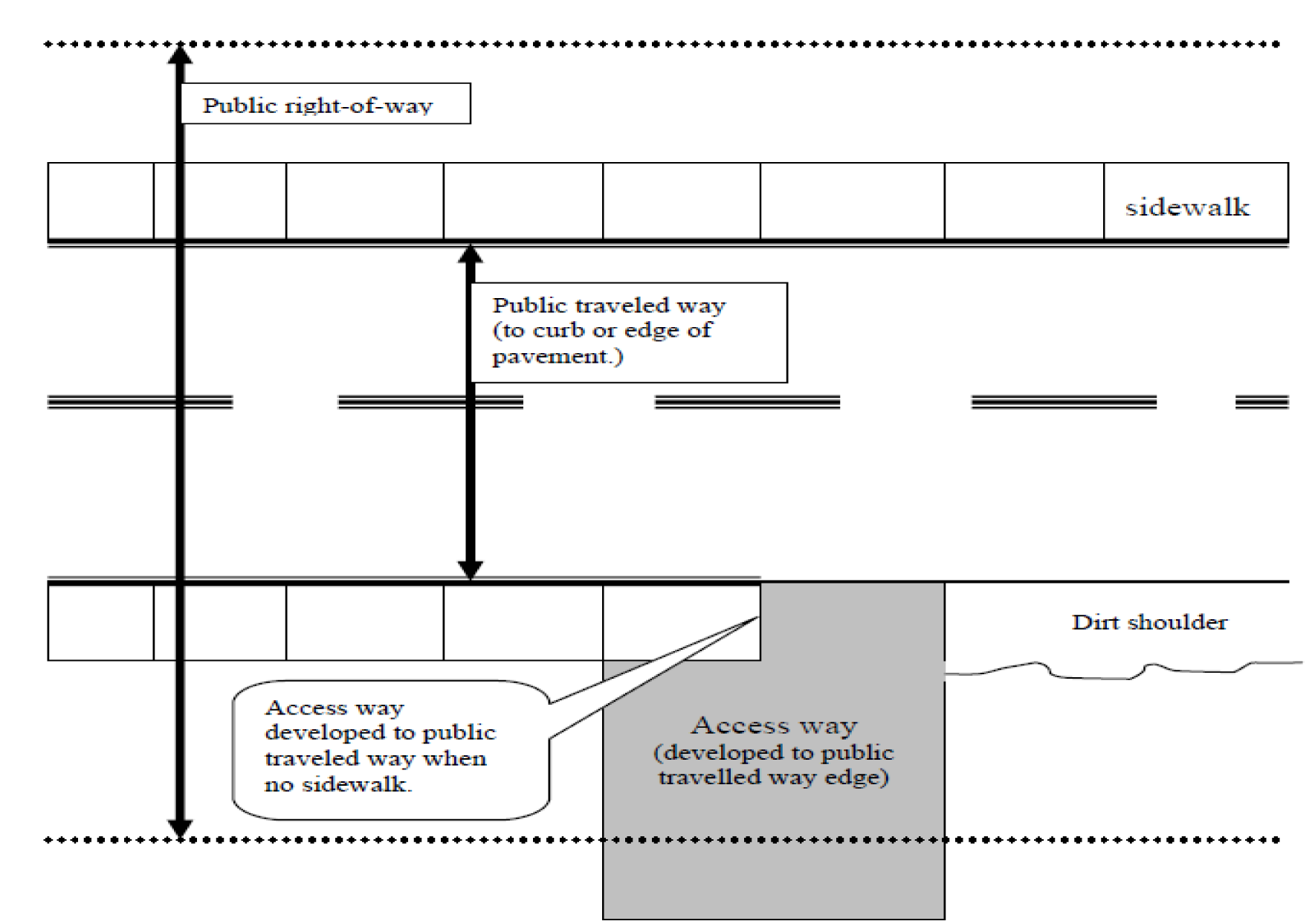 Public traveled way. The entire width between the boundary line of every way (from curb to curb and/or edge of paved or graveled roadway) maintained by a public authority and that is open to public use for the purpose of vehicular or other mechanized transit traffic (see Figure 12.7).