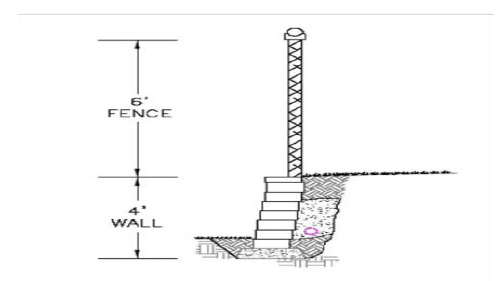 The retaining wall is not part of the fence in this illustration. Retaining walls